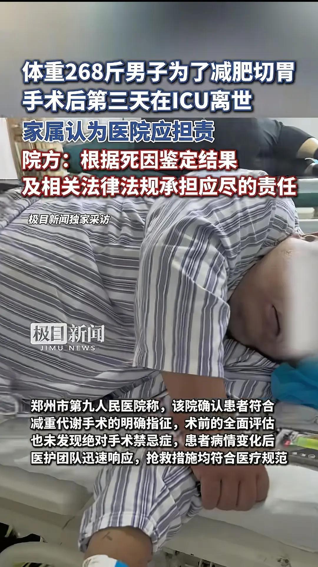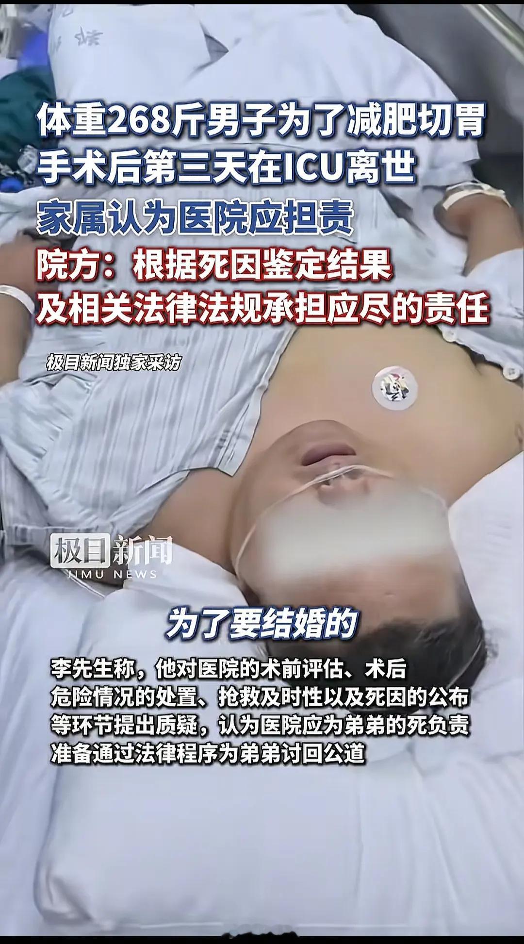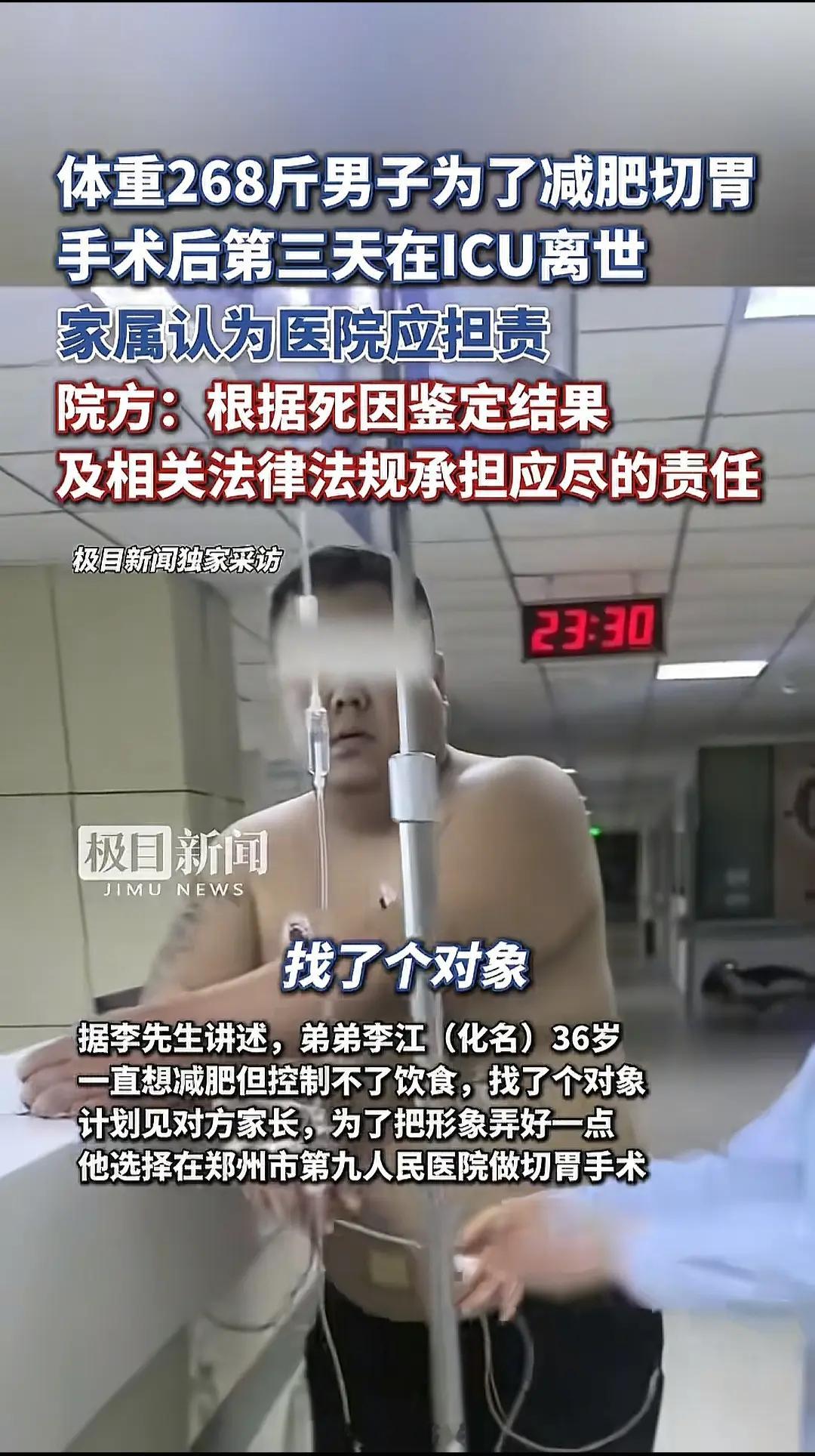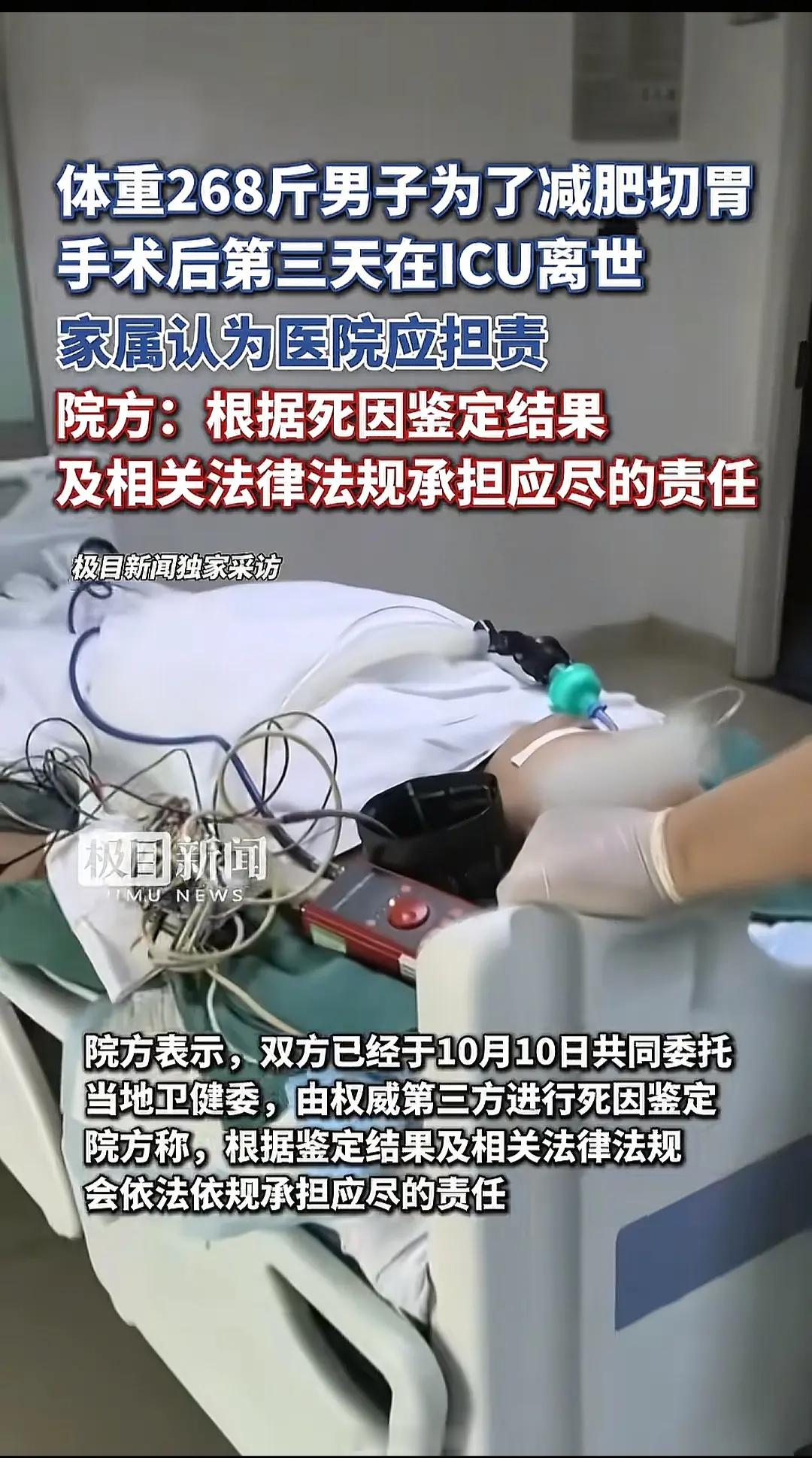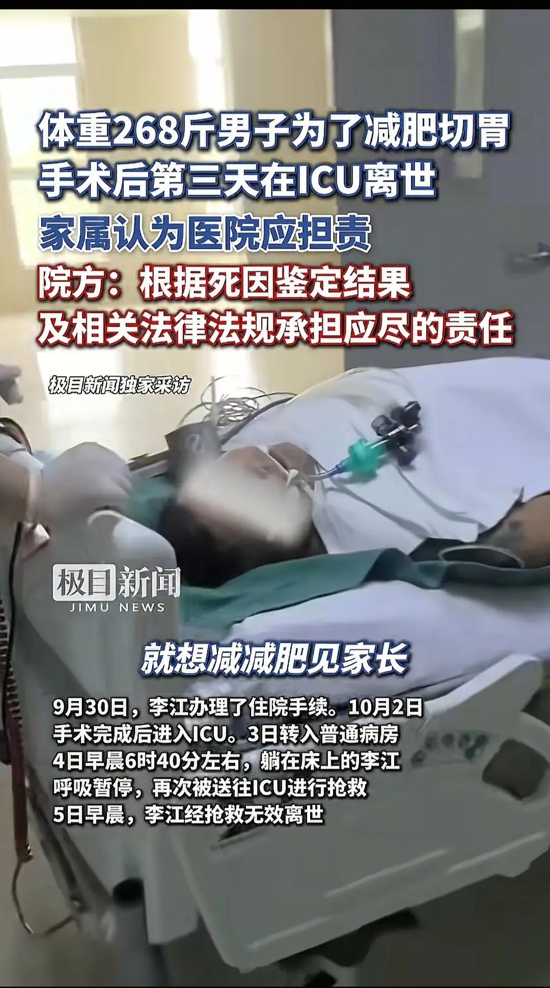 268斤男子做切胃手术后在ICU身亡 268斤,找了个对象想要减肥见家长。但本身肥胖,控制不了饮食,想要靠切胃手术减肥,但却忽视这种手术本身风险极大!个人提醒想减肥的人,最好的方式是通过健康饮食和规律运动。这种切胃手术,是胖到不得已的情况才采取的极端手段,268斤,完全可以通过常规的方式减肥的。可惜了…[流汗][流汗][流汗]