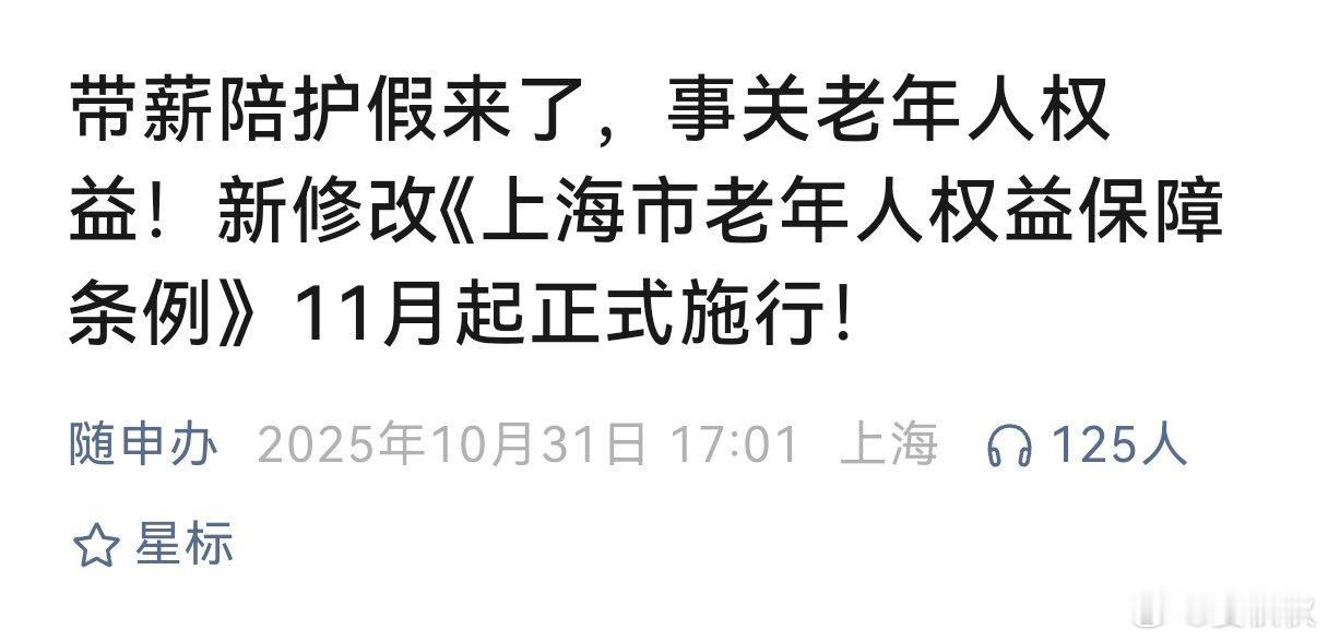 上海人请注意,从今天(1日)开始,新修改的《上海市老年人权益保障条例》施行,新增的陪护假开始实施。