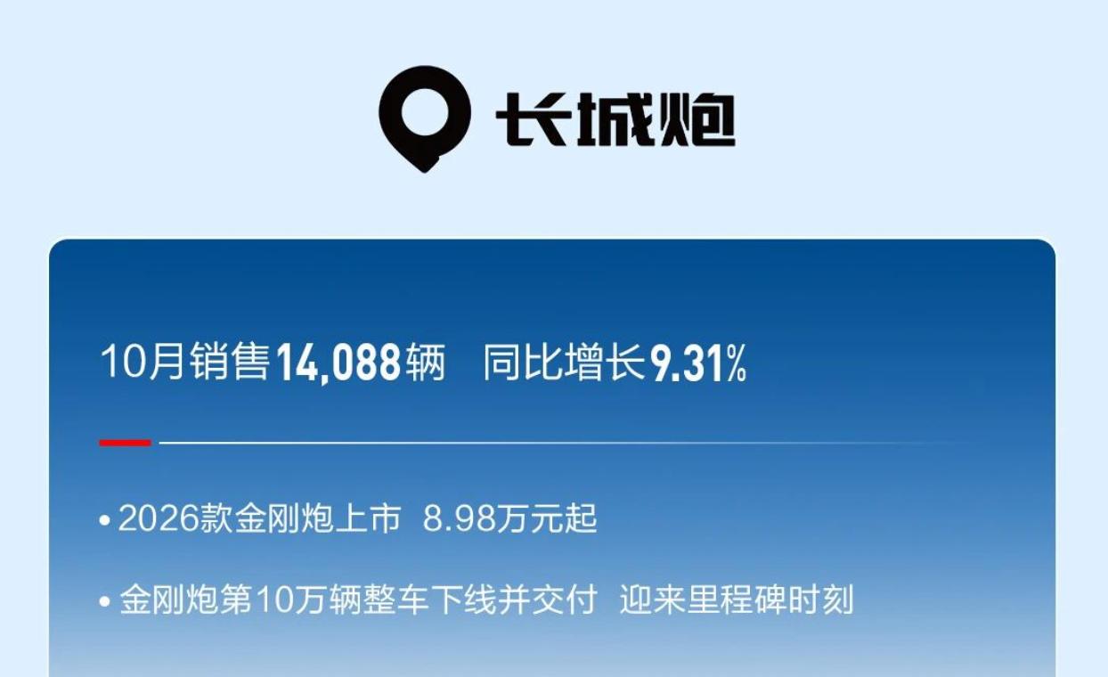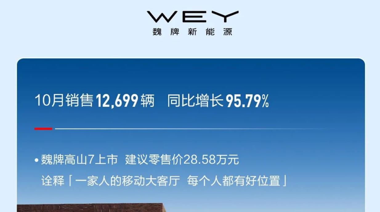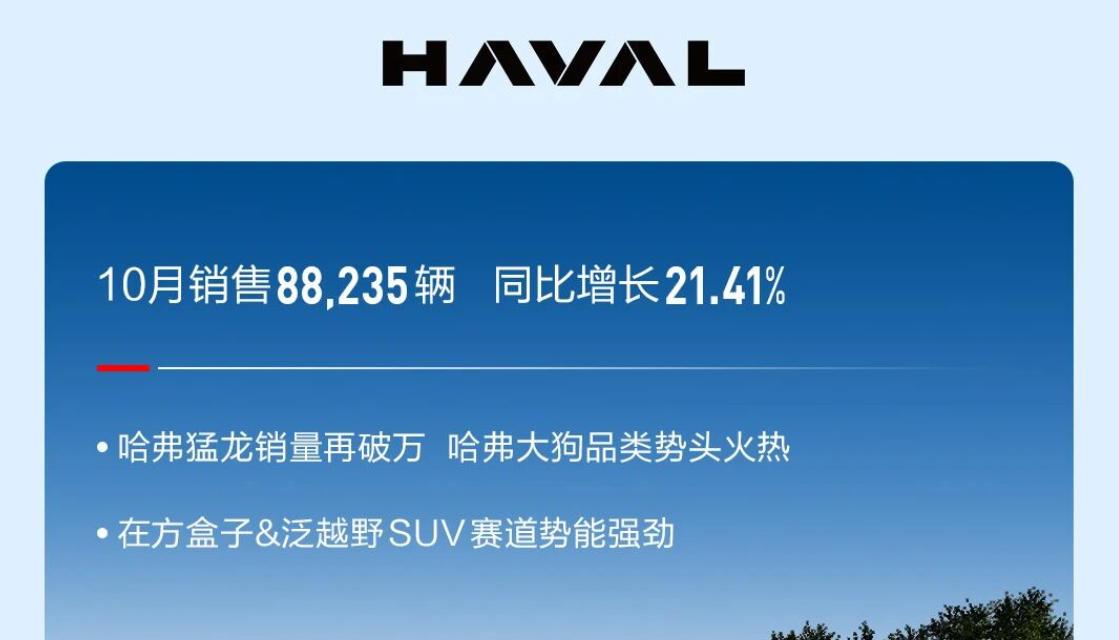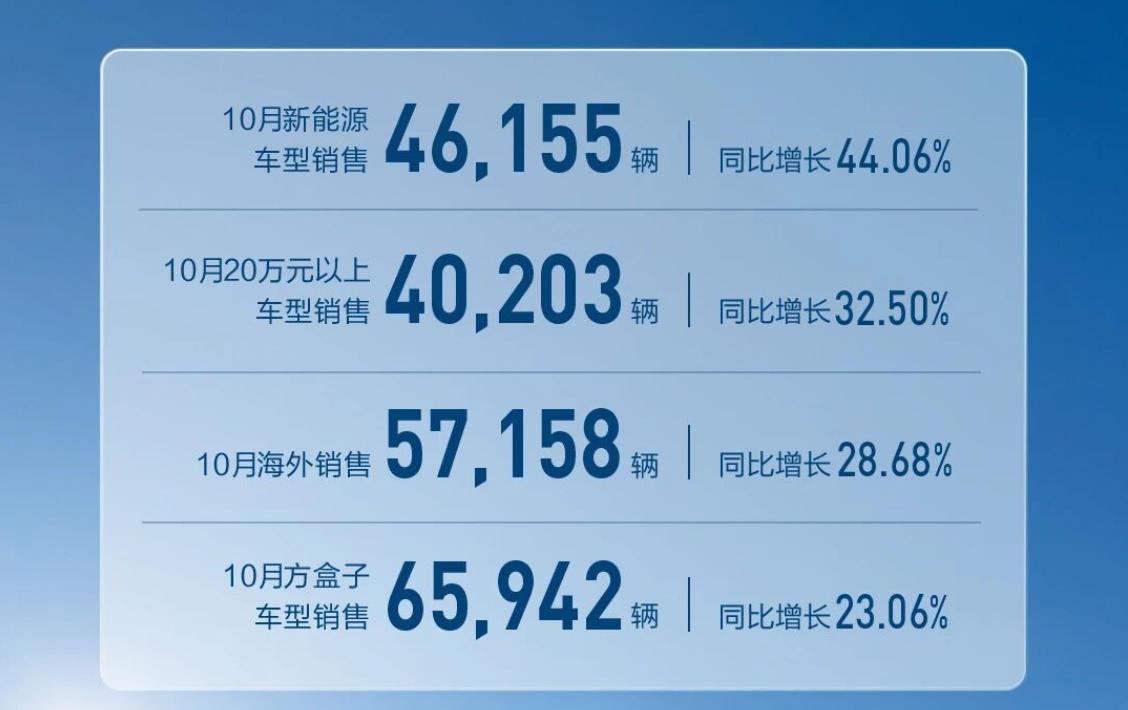 史上卖的最好的10月,长城10月份卖了143078台,同比增长22.5%,其中20万以上车型卖了40203台,海外销量卖了57158台,方盒子一共卖了65942台,主要是哈弗品牌的销量起来了。1-10月份长城一共卖了106万多同比增幅9.87%,按照当下的销量来看,今年长城的销量可能会达到135万台左右,如果按照10月份的增幅来的话,有希望冲击140万台,整体表现还是不错的,长城如果在纯电SUV上再发力一下,会是一个新的增长点,在纯电新能源上,长城还是保守了。