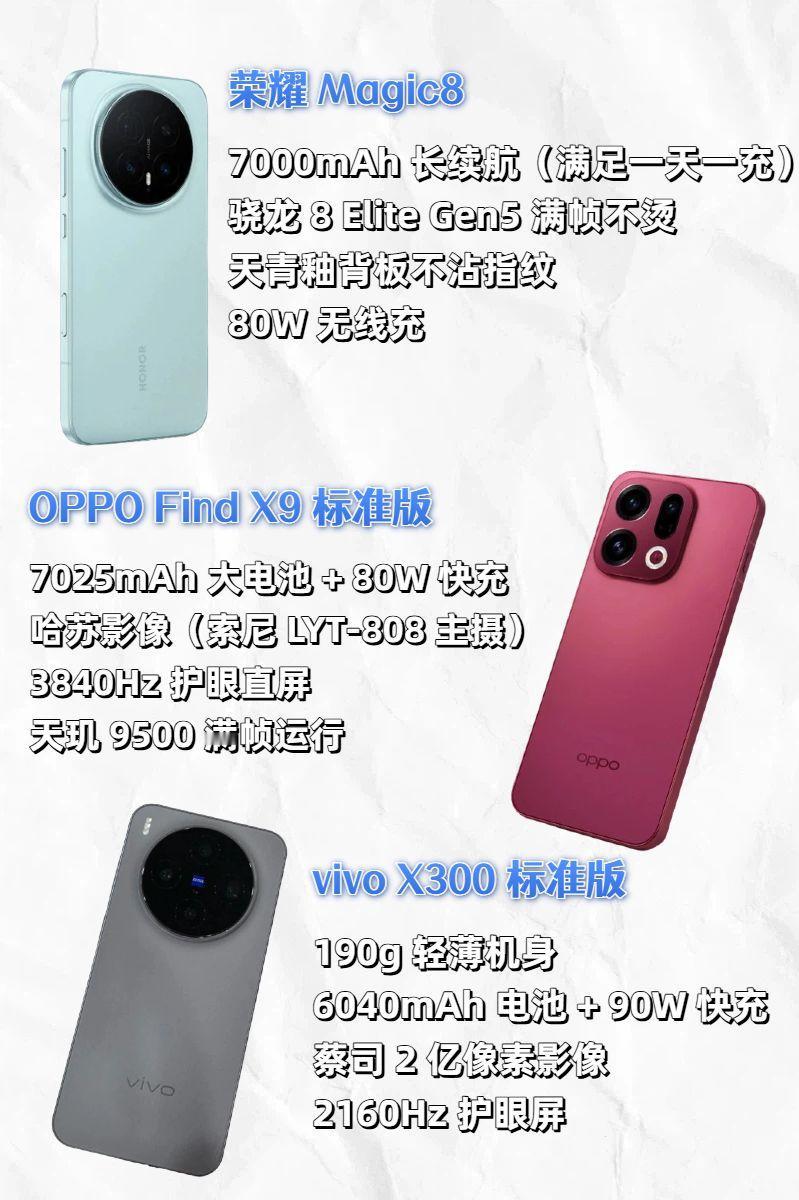 三款热门标准版旗舰,我为何最终选了荣耀? 预算四五千,在OPPO Find X9、vivo X300和荣耀Magic8之间纠结了好久。分享一下我的真实体验: vivo X300:拍照色调绝美,手感小巧,但电池没上7000mAh对我这种重度使用用户是硬伤。 OPPO Find X9:ColorOS系统流畅,AI功能好用,但屏幕看久了眼睛容易累,个人不太适应。 荣耀Magic8:屏幕护眼是实实在在的舒服,7000mAh电池带来满满安全感,加上骁龙芯片更让我放心。 最后选择荣耀,是因为它在我最看重的续航、护眼和性能稳定性上做到了最好的平衡。 你在标准版中最看重哪一点?欢迎分享你的选机思路!荣耀Magic8 荣耀Magic8Pro