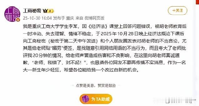 女生肠子都悔青了! 没想到踢铁板上了。 事发重庆工 商大学。 她叫胡霞,是人 民大学的法学博士,今年刚到重庆工 商大学任教。 事发时,胡老师发现课堂上一位女生不认真。 就想提问她又担心答不出影响情绪。 于是就提问了一个简单的老问题:分公司和子公司的区别? 结果,女生没答上来。 胡老师想课后找她谈谈别有情绪。 没想到女生一句“老子不伺候”便扬长而去。 之后,女生竟在学校工 商秘密网站上发文诋毁胡老师。 说她:上课刻薄,魅男行为频出。把没礼貌当幽默,还觉得自己是女强人,用教师身份压人,太搞笑了! 这是网暴! 胡老师没惯她,直接反击,让她每一条都要找出证据,否则就起诉她! 女生意识到严重性,想私聊道歉。 胡老师不接受:你捏造事实,你要承担法律责任,严重的就是诽 谤罪。 女生公开道歉也不行! 道歉行的话还要法律干什么?胡老师义正辞严。 我要把这件事当案例讲给同学们听,什么叫侵权?什么叫犯罪? 学有所用吧! 并非老师有错不能说,对老师的指责要有事实根据,任何举报都绝 不能是诬 告。 胡老师,好样的! 你给所有的师生上了一课,让老师有一种如释重负的感觉… “师道尊严”又回来了!