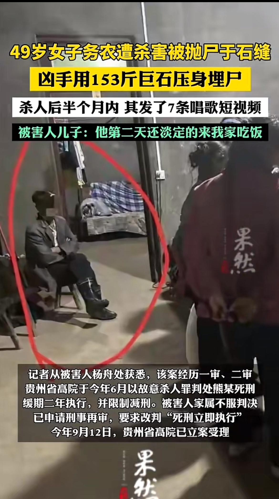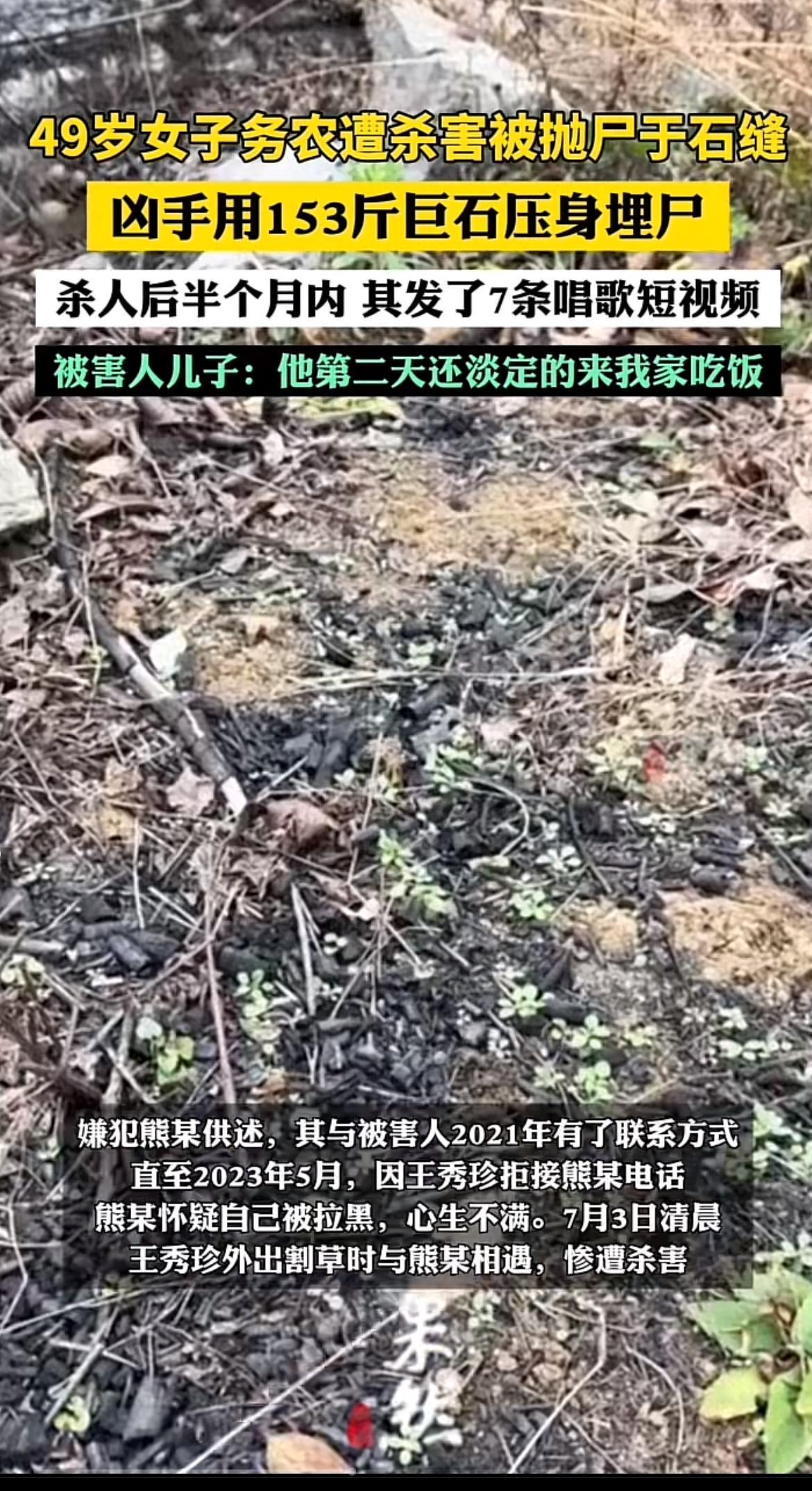 太让人痛心了!2023年7月3日清晨,贵州49岁的王秀珍像往常一样出门割草,却惨遭毒手。她的尸体被裸身埋入石缝,家属和村民苦苦找了近一个月都没结果。谁能想到,那个一直“热心”参与搜寻、还在被害人家吃饭的“伯伯”熊某,竟是凶手。 熊某是王秀珍二嫂的同居男友,就因之前打电话被拒,便怀恨在心,用尼龙绳勒死了她。2025年6月,法院判熊某死缓,家属不服申请再审。这凶手如此冷酷,真希望法律能还死者一个公道,给悲痛欲绝的家属一些安慰。