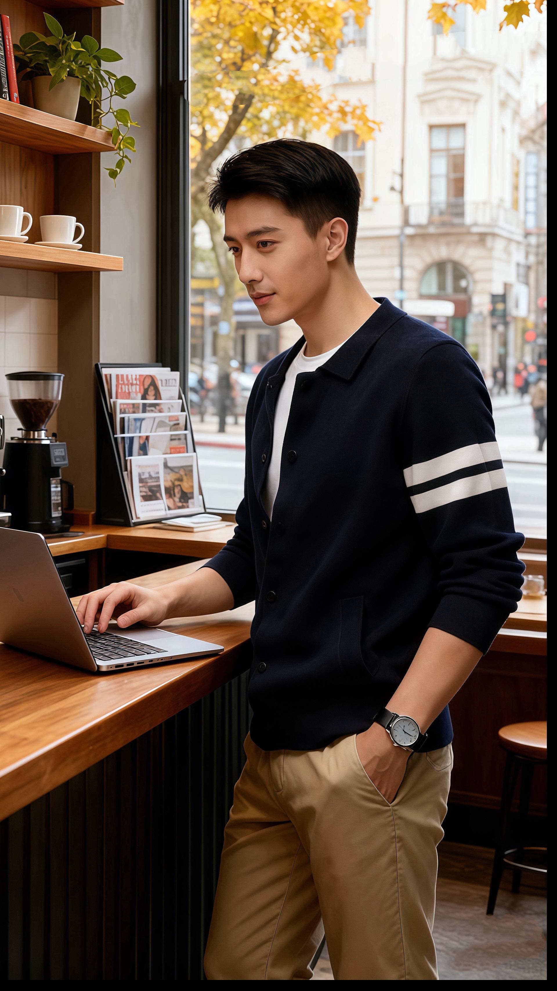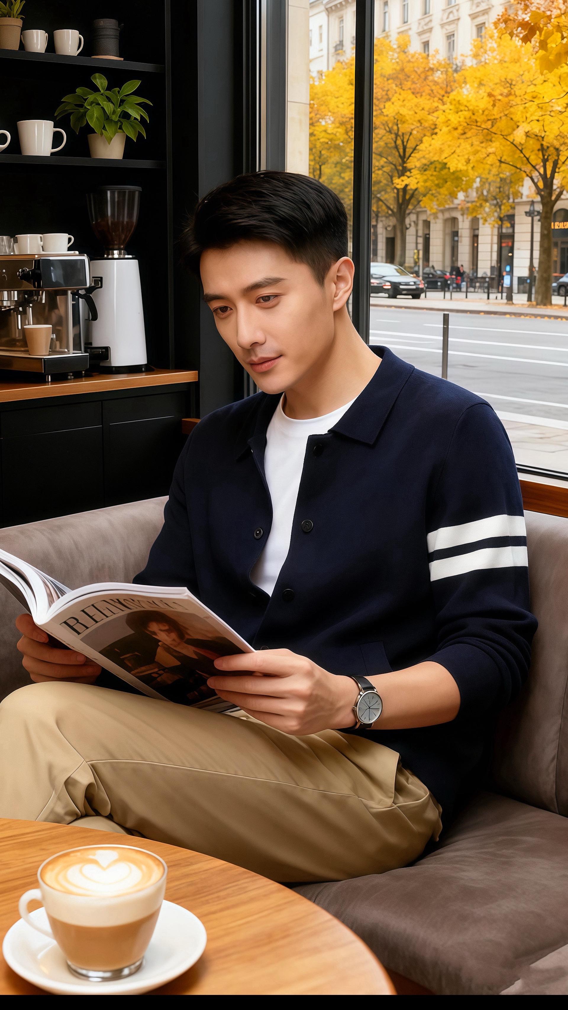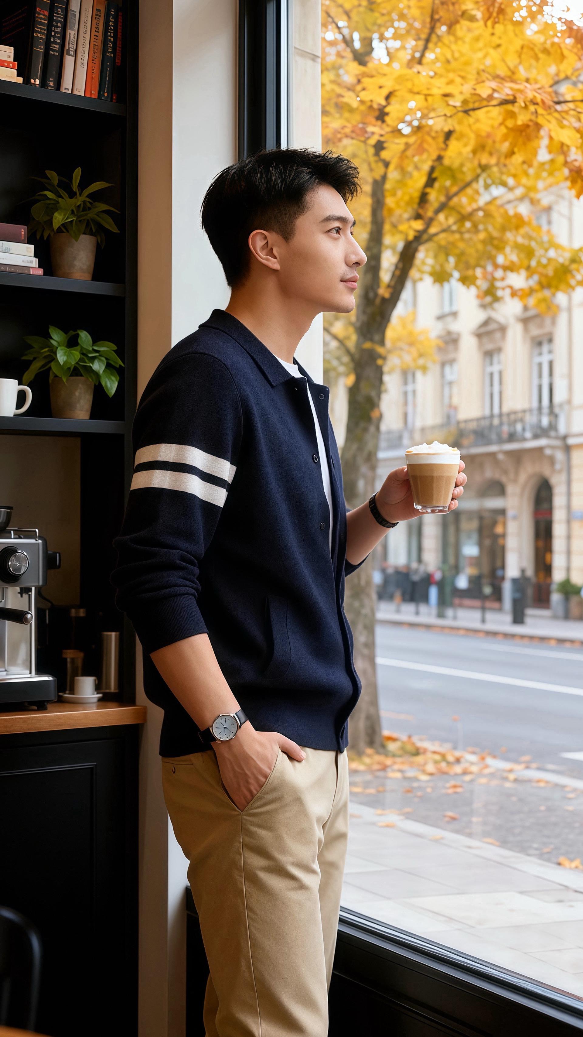秋阳裹着银杏香漫进咖啡馆时,许妍刚推开玻璃门,视线就撞进窗边那道身影里。 皓明倚着窗沿,藏青开衫松松笼着干净的白T,袖口两道浅白条纹衬得手臂线条利落,卡其裤的版型刚好熨帖出柔和的腰线,腕间的表盘浸在光斑里,连衣料的织纹都泛着温软的光泽。他指尖捏着咖啡杯,目光落向窗外铺了半街的黄叶,像把整个秋日的闲适都穿在了身上。 许妍攥着点单纸的指节微紧,转身时碰翻了吧台上的糖罐,玻璃珠滚了一地。皓明的动作比她的道歉快,弯腰捡起一颗递过来:“小心滑。” 她抬眼撞进他的笑里,轻声说:“你这件开衫的质感看着很舒服,和卡其