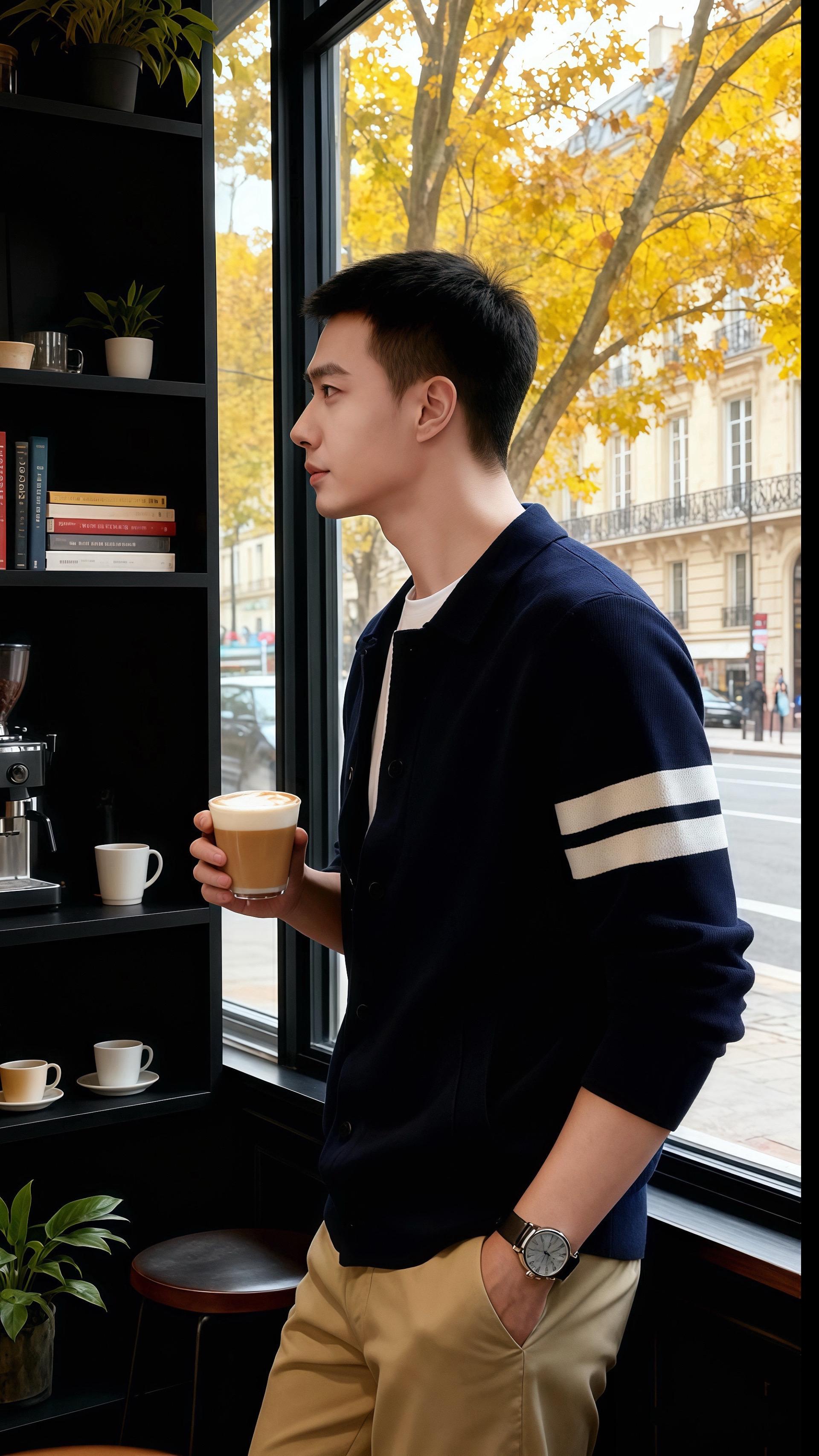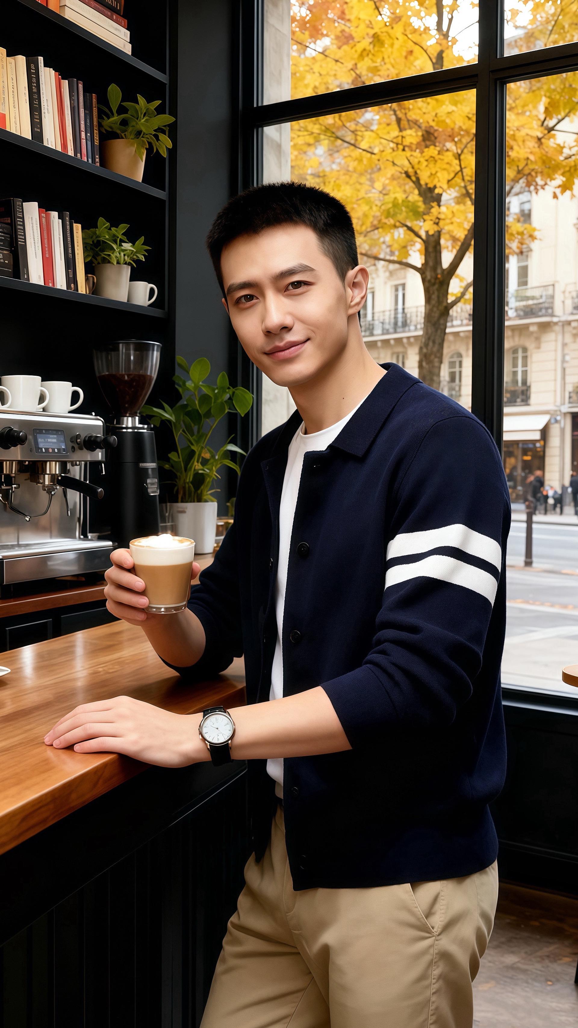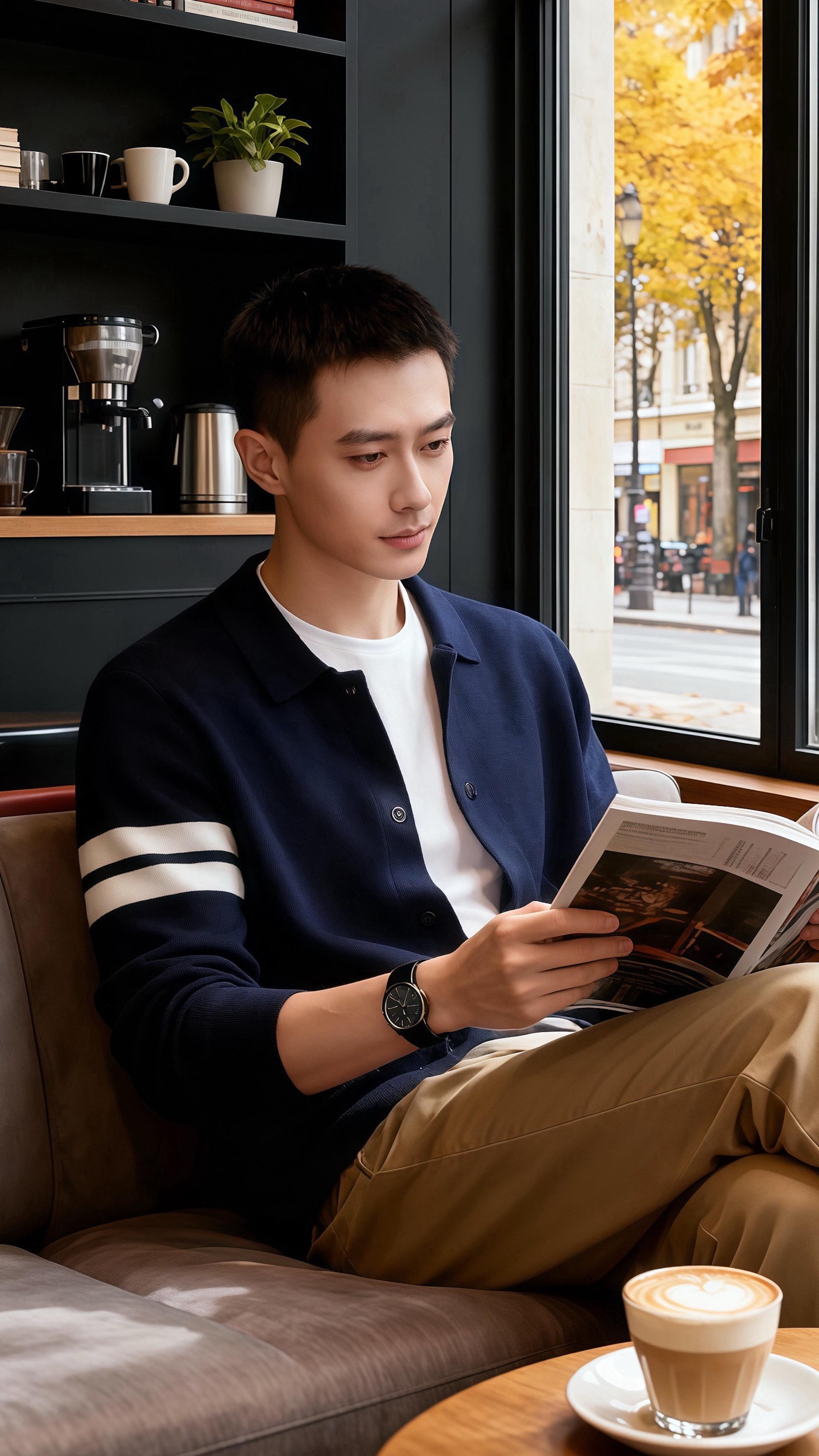 是皓明。藏青开衫松松裹着干净的白T,袖口两道浅白条纹衬得手臂线条利落,卡其裤的版型刚好熨帖出腰线,腕间的表盘衬得整个人温温的——像把秋日的软风都揉进了穿搭里。