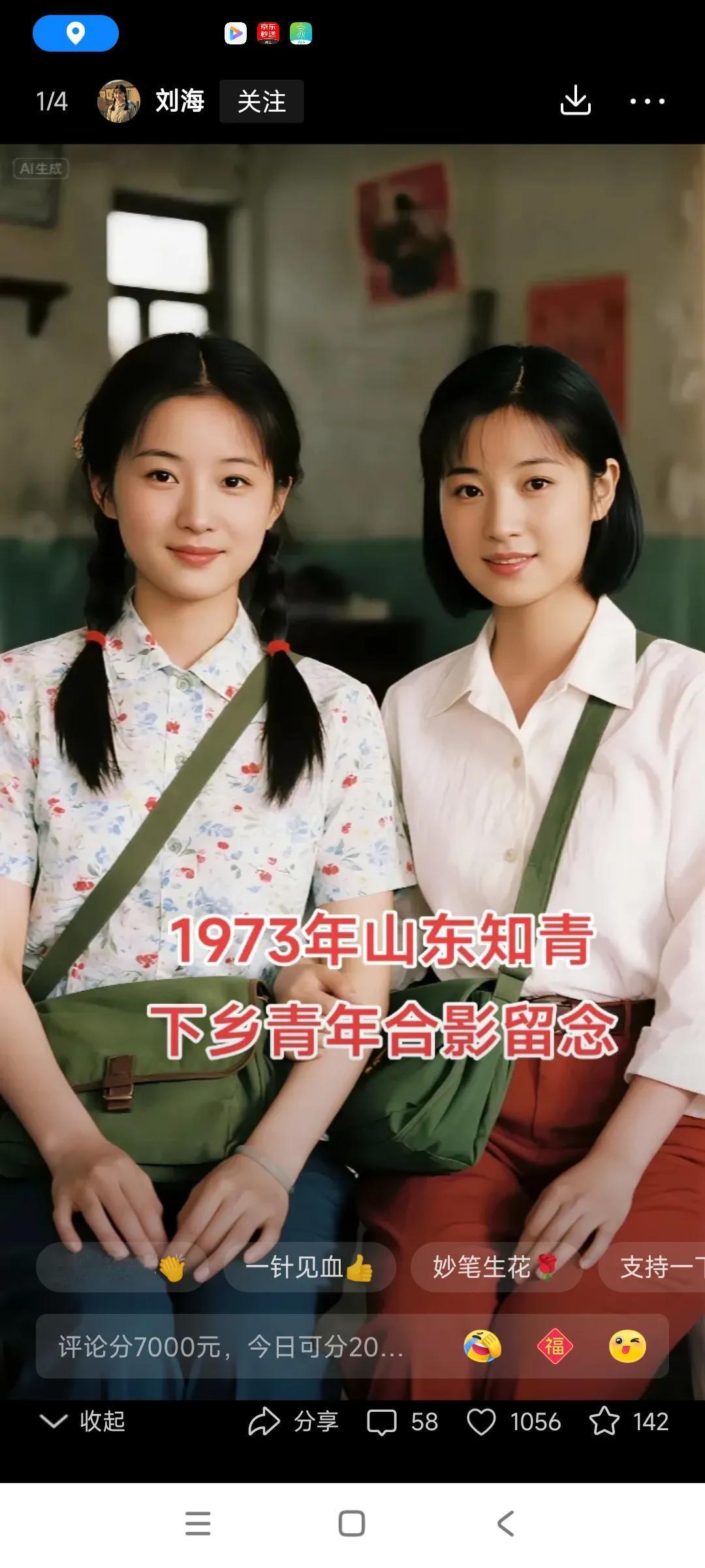 可能是AI的,上个世纪的下乡女青年也太美了,比现在的明星都要美,据说当时有几百万人去了农村,接受贫下中农再教育,,,[捂脸][捂脸] 不过,当时虽然吃得差,白面馒头基本上吃不到,吃窝窝头,我也吃过,不怎么好吃,,头发都浓黑的,皮肤也好,不知道为什么,,,,