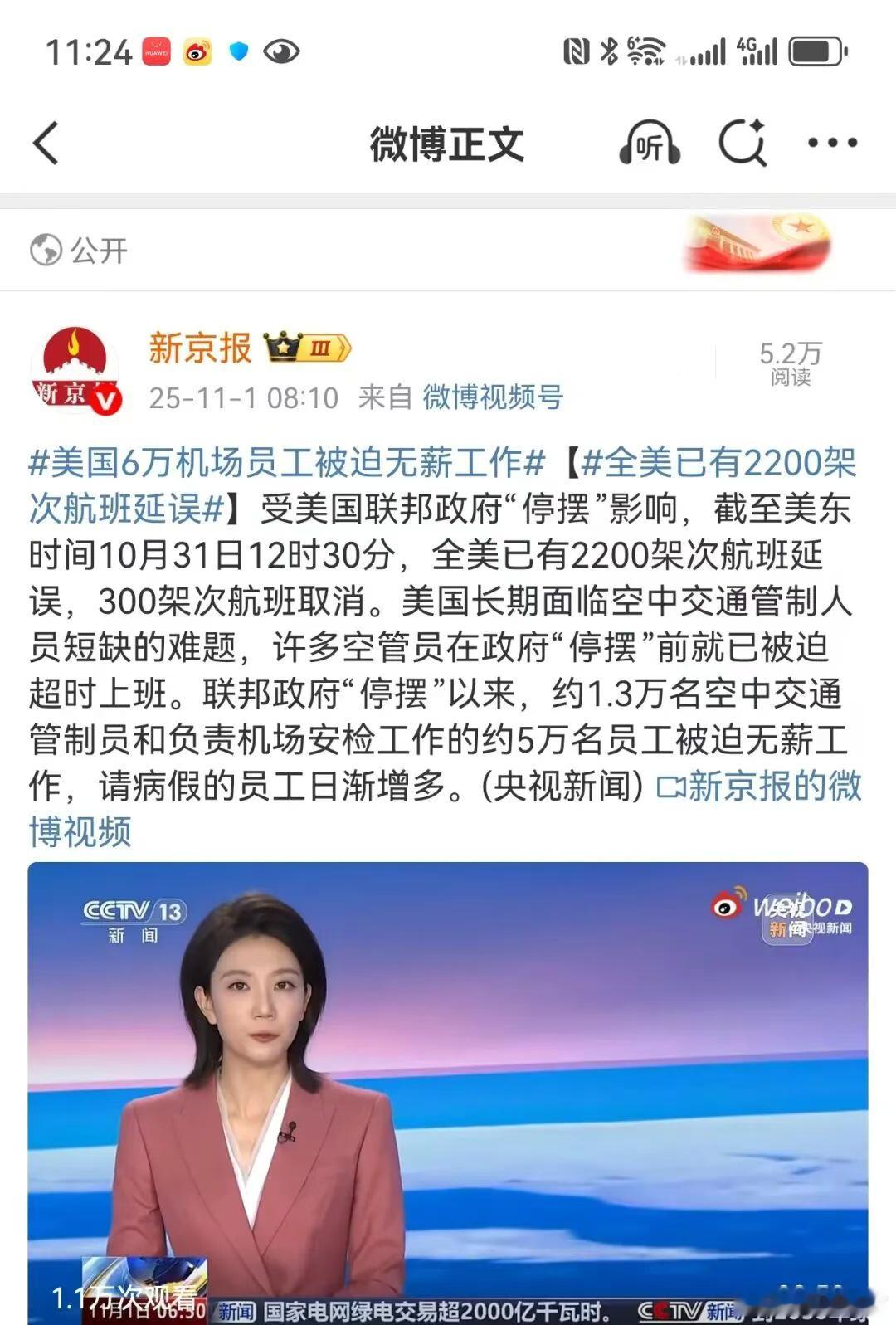 上月,美国总统特朗普在白宫证实,基于美国政府此前对他发起的一系列调查与起诉,美国司法部“欠”他一大笔钱。据报道,特朗普要求美国司法部支付高达2.3亿美元的巨额赔偿。为此,特朗普将起诉特朗普政府,判决获得支持后,该款项将由特朗普本人审批通过。看看,人家这操作多顺溜。若是这6.3万名机场人员都是总统,这事就好办了。说到底,美国的总统还是少了点,总统多了啥事情都解决了。机场薪水停了后,空管岗位缺勤率从正常5%飙升至53%,部分机场(如加州伯班克)曾出现6小时完全无人值守的极端情况。