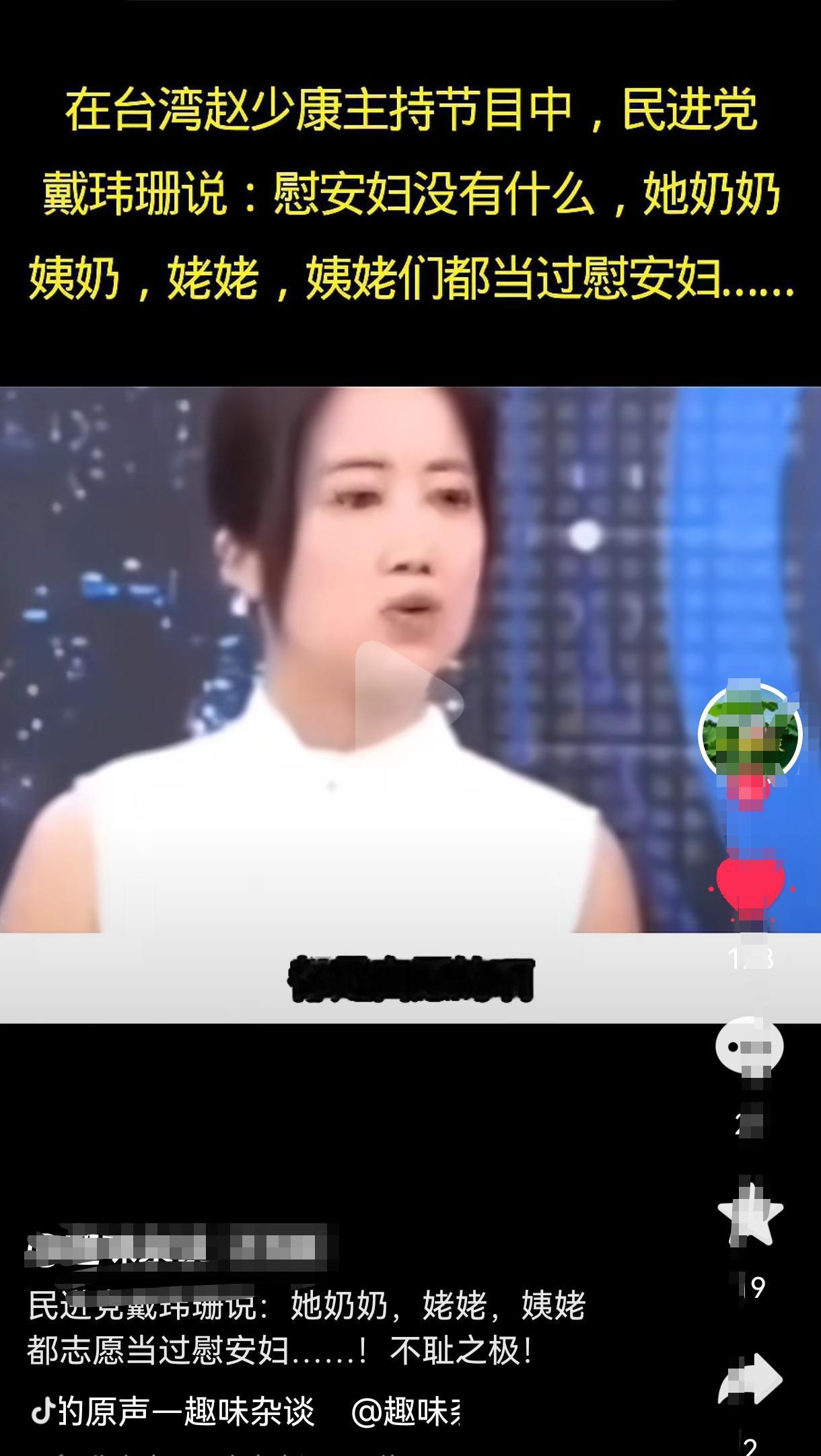 民进党发言人戴玮姗说:慰安妇没有什么,她的奶奶、姨奶、姥姥、姨姥们都当过慰安妇,都是自愿的。说得时候还很自豪,引以为荣。她说这话不仅是对慰安妇的极大不尊重,更是道德沦丧,不知羞耻。到底是什么样家庭才能养出如此厚颜无耻之畜生,台湾真的是道德和智商的洼地。