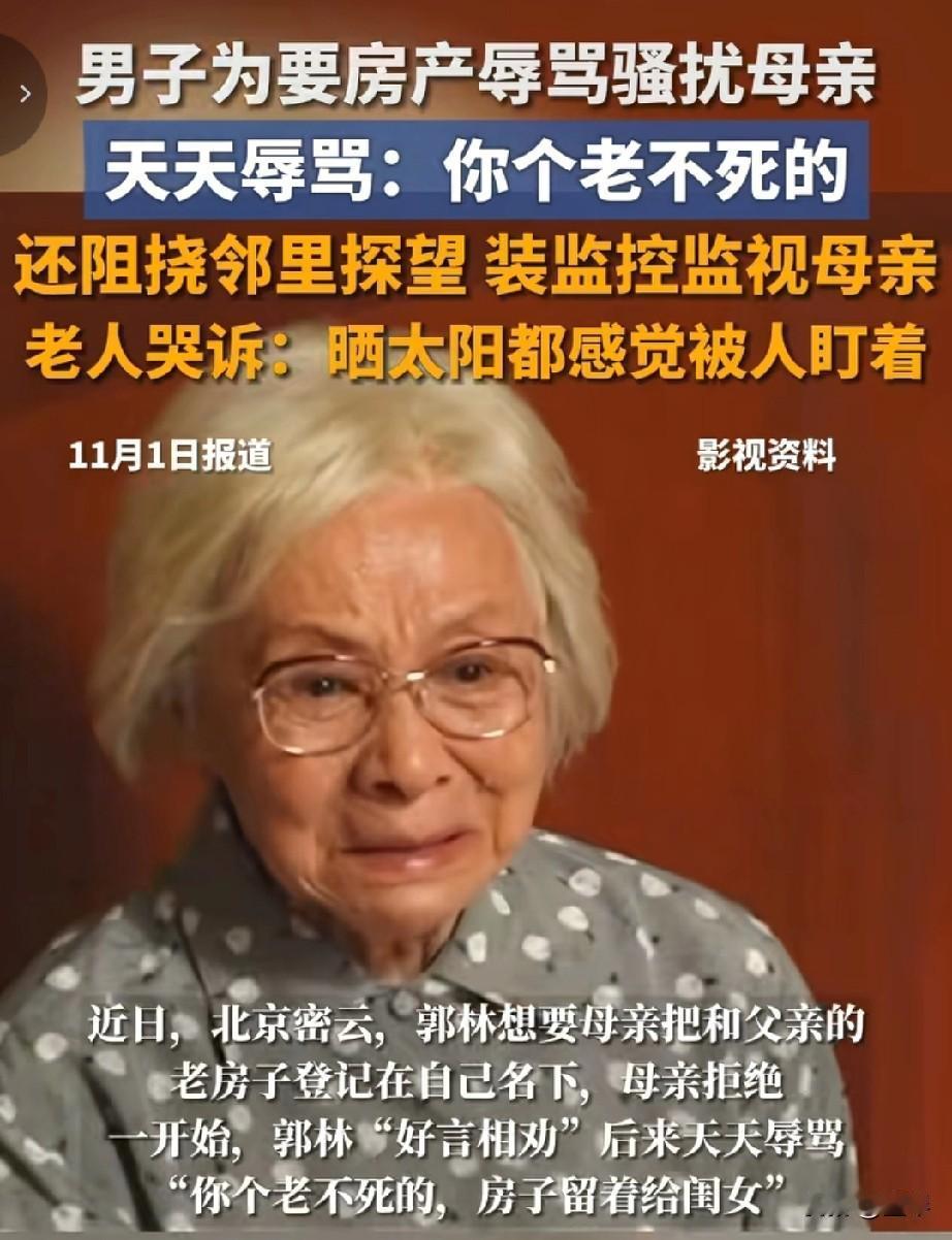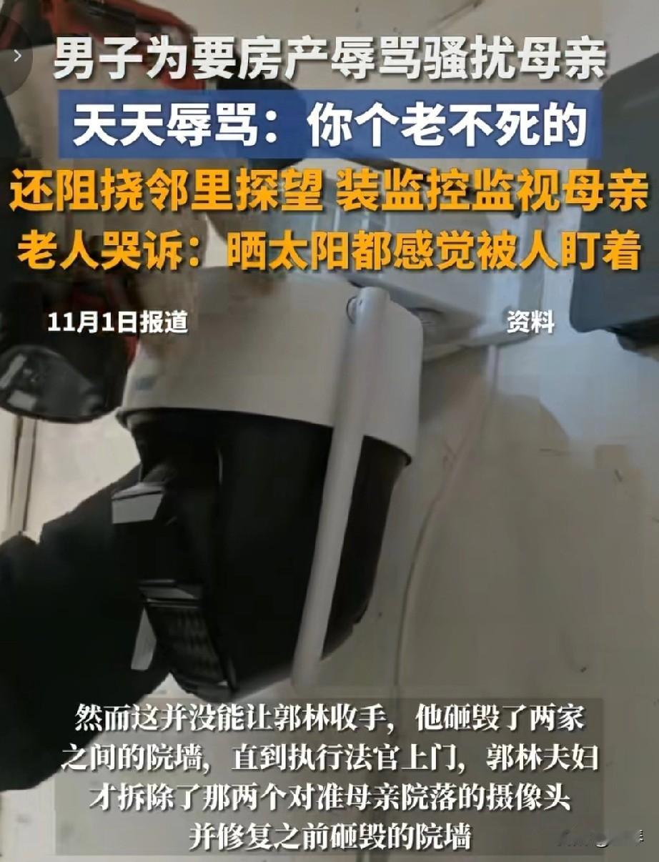 这样的不孝子老天就该一个雷劈死! 这是人干的事儿?亲妈把他从一尺长养到顶天立地,他倒好——为了房产把亲妈当仇人:张嘴就是“老不死的”,装监控把亲妈锁成“笼中鸟”,连邻居探个望都要拦着! 老人晒太阳都发慌,这哪是家?是亲儿子给亲妈造的地狱!生他养他的恩情喂了狗,这畜生的心是烂透了的黑炭! 就该让法律把他钉在耻辱柱上,这种玩意儿,活着都是糟蹋空气! 生养一场,养出这么个狼心狗肺的东西。老人掏心掏肺养他长大,临了落得被亲儿子当贼防、当仇人骂,这哪是儿子?是披着人皮的恶鬼! 还好女儿懂事儿,带着他妈去申请人身安全保护令——这种不孝子就该被法律管、被良心戳,别让老人寒了一辈子的心! 倘若这男子但凡孝顺一点,他老母亲会把最后的权利交给女儿吗?自己不反思自己,反而责怪老人,真是缺德没边了。 赡养老人那些事 家家有本难念的经