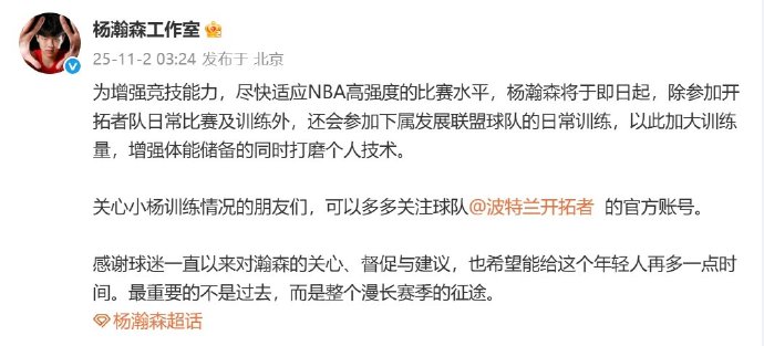 杨瀚森工作室 发布声明:感谢球迷一直以来对瀚森的关心、督促与建议,也希望能给这个年轻人再多一点时间。最重要的不是过去,而是整个漫长赛季的征途。