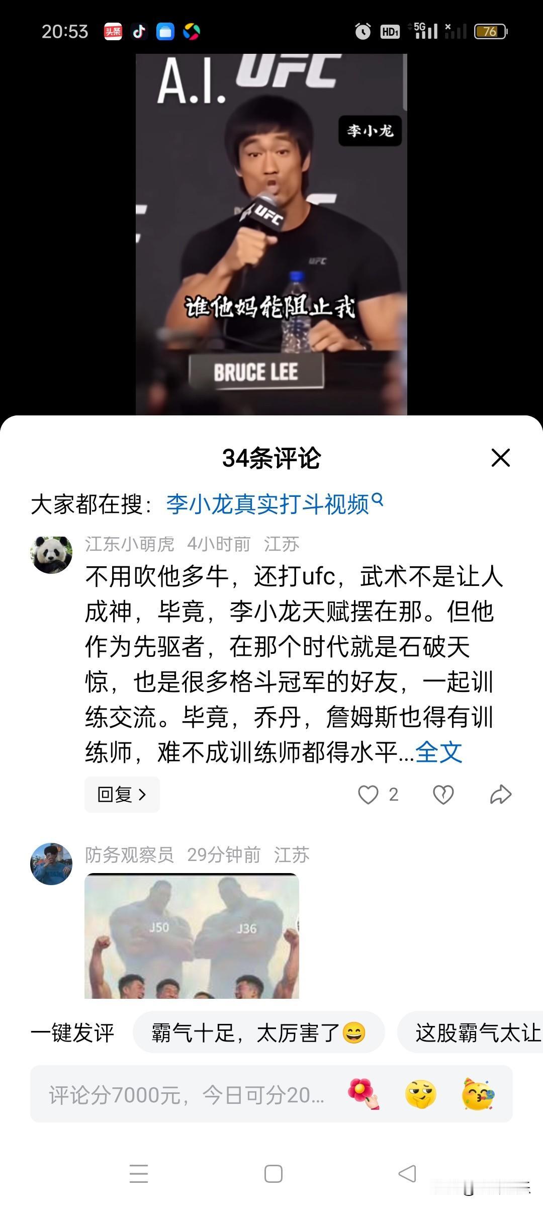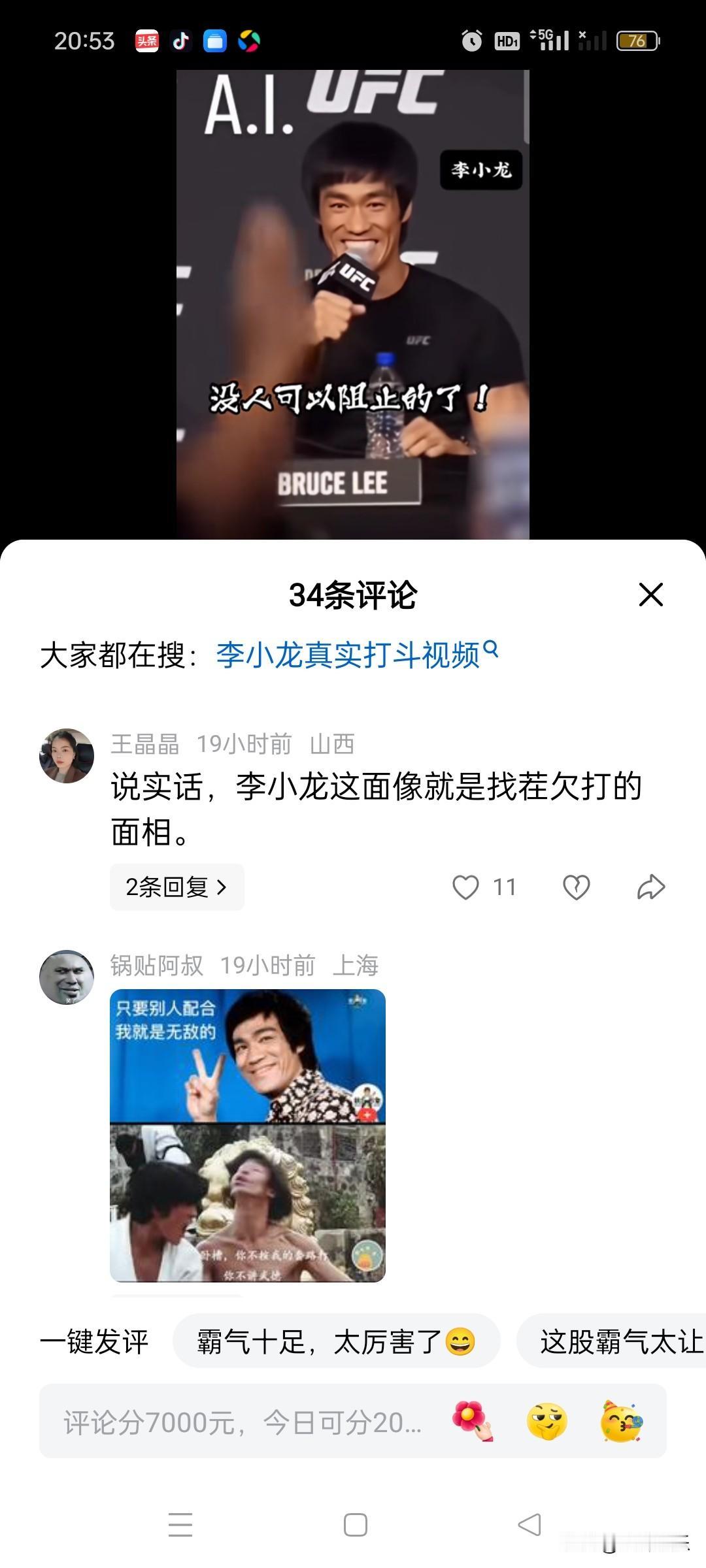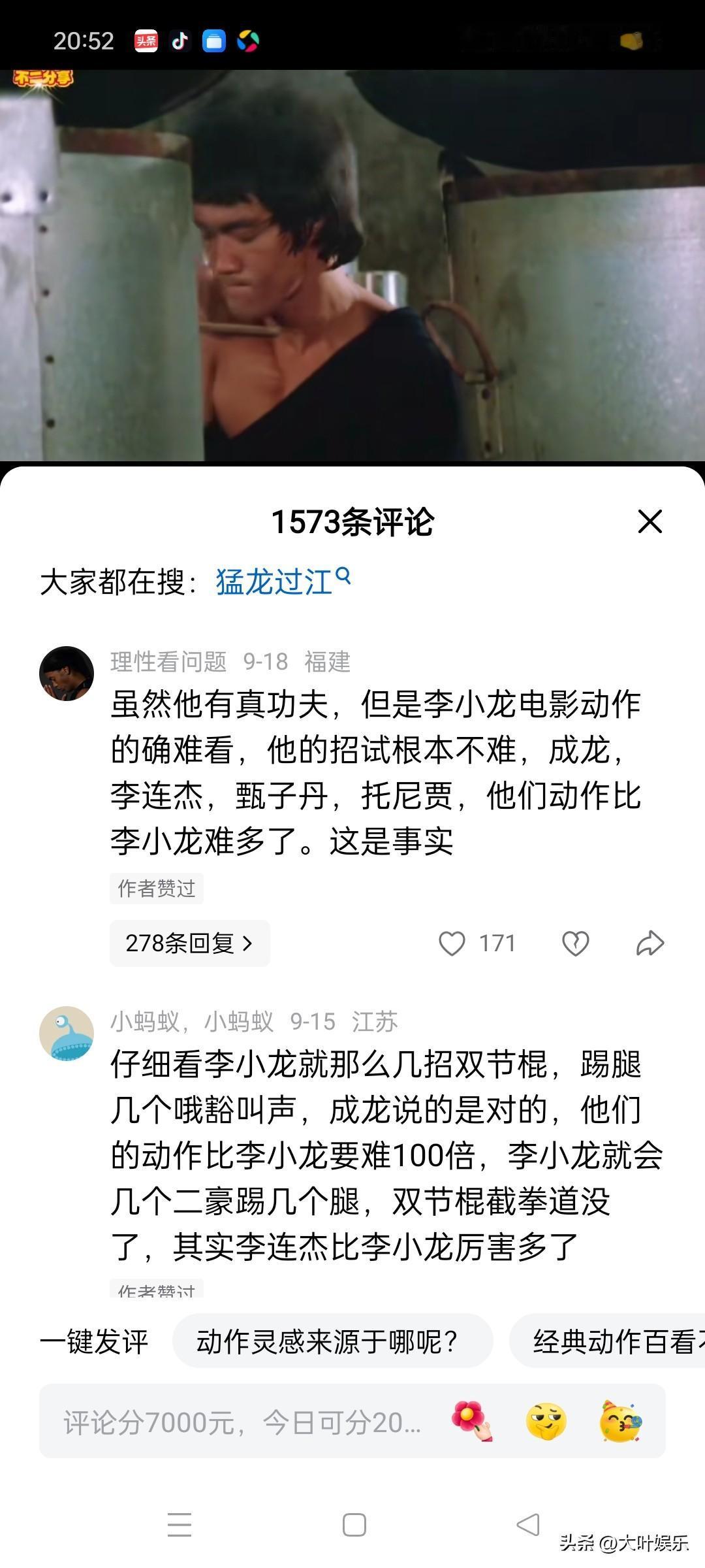 李小龙也被他们利用。各种评论区已经大量涌现攻击和抹黑李小龙的人,这些人目的性很强,就是贬低李小龙,贬低中国功夫,让国人产生怀疑乃至丢失自信。 希望平台重视,关注这些人的言论。