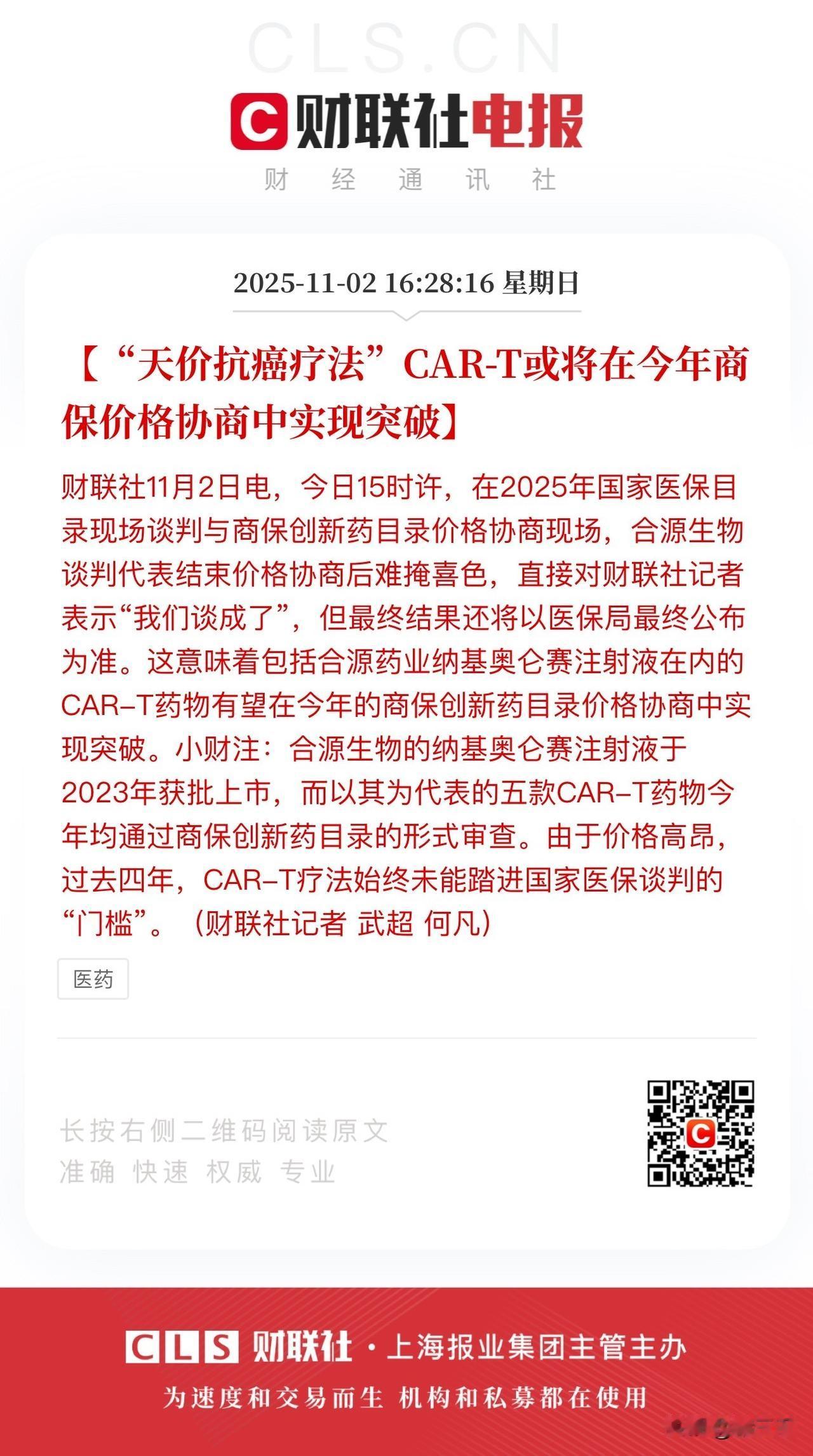 就等国内企业把CAR-T价格打下来了! CAR—T是癌症早中期患者完全康复的希望, 相信A股生物医药企业很快能, A把价格干成5万一针, 把全过程治疗价格打到10万以内! 也相信在治癌、抗癌、防癌上能全面突破! 最主要都还是树立民众健康体检意识, 这一方面国有企事业单位、外资企业做的很好, 员工体检纳入福利保障项目。 未来估计CT项目、癌症筛查也会成为常规项, 每个人辛勤劳动都是推动社会经济发展, 进而社会福利提升反哺普通百姓。 愿早日攻克癌症, 愿天下无癌! …