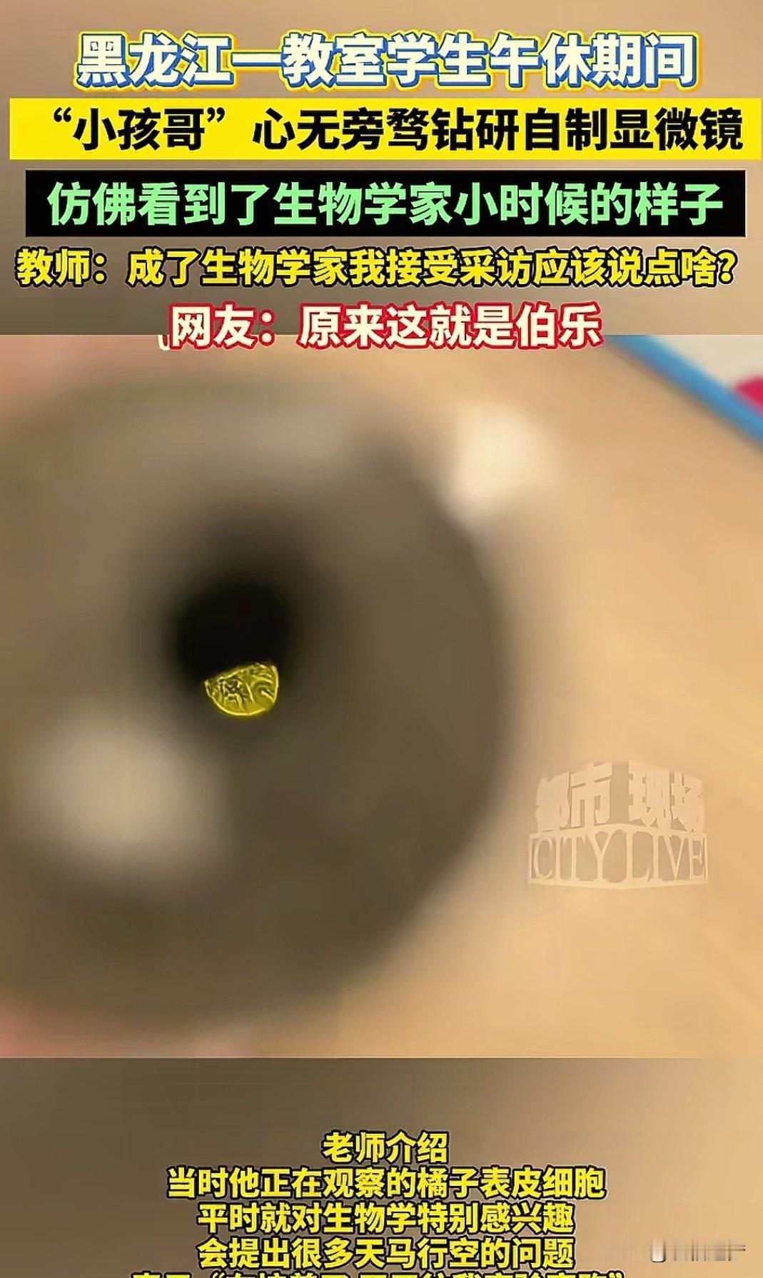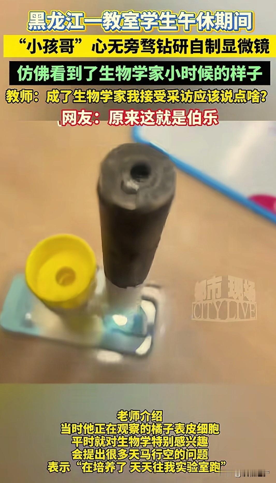 “这小孩哥火了!”,黑龙江,一名初中男生,午休期间,自己制作了一个简易显微镜,镜头上下一调,出现了不可思议的一幕,小小的镜片里竟然成功看清了橘子表皮细胞。网友:那么复杂的显微镜,这么轻松就做出来了? 少年强则国强,这句话的含金量还在上升! 男生只用了5样东西,一个固体胶棒,两个激光笔壳子,一个小灯泡,一个载玻片,和一根结实的铁丝。和在一起,组成了一个简单而实用的显微镜。 里面的东西几乎花不了几块钱,却呈现出了实验室普通显微镜的效果,像橘子皮、洋葱表皮细胞,都可以看的一清二楚。 而这一切,除了老师的悉心教导,更离不开男孩的聪明和上进,在别人都午睡时,他拿着显微镜仔细看,在别人下课出去玩时,他跑到老师实验室问一些天马行空的问题,有这样的学生,老师再累也会觉得欣慰! 有网友说:这股专注劲儿也太酷了吧,赶紧分享一下怎么做的,我也让孩子做一个。 也有网友觉得不可思议,这么简单就做出来那种高大上的东西,以前怎么没发现? 视频里,男生专注的调节着镜头的上下距离,很快就找到了观看橘子皮最 佳的画面,这可真是一个随时随地都可以使用的一个宝贝啊,相信有了这个工具,以后男孩肯定会观察更多的植物,发现课本上没有的知识。 不过,这个简易显微镜虽然看起来简单,也不是随便组装就可以的,激光笔除了壳子留下,上面的小玻璃透镜才是最关键的一部分,同时还要在壳子里卷上黑色卡纸,除了聚拢里面的光线,还要防止外面光线射进去。 家里有孩子感兴趣的完全可以试着做一个,既锻炼动手能力,又能观察到平时看不到的小世界。 (来源:都市现场)