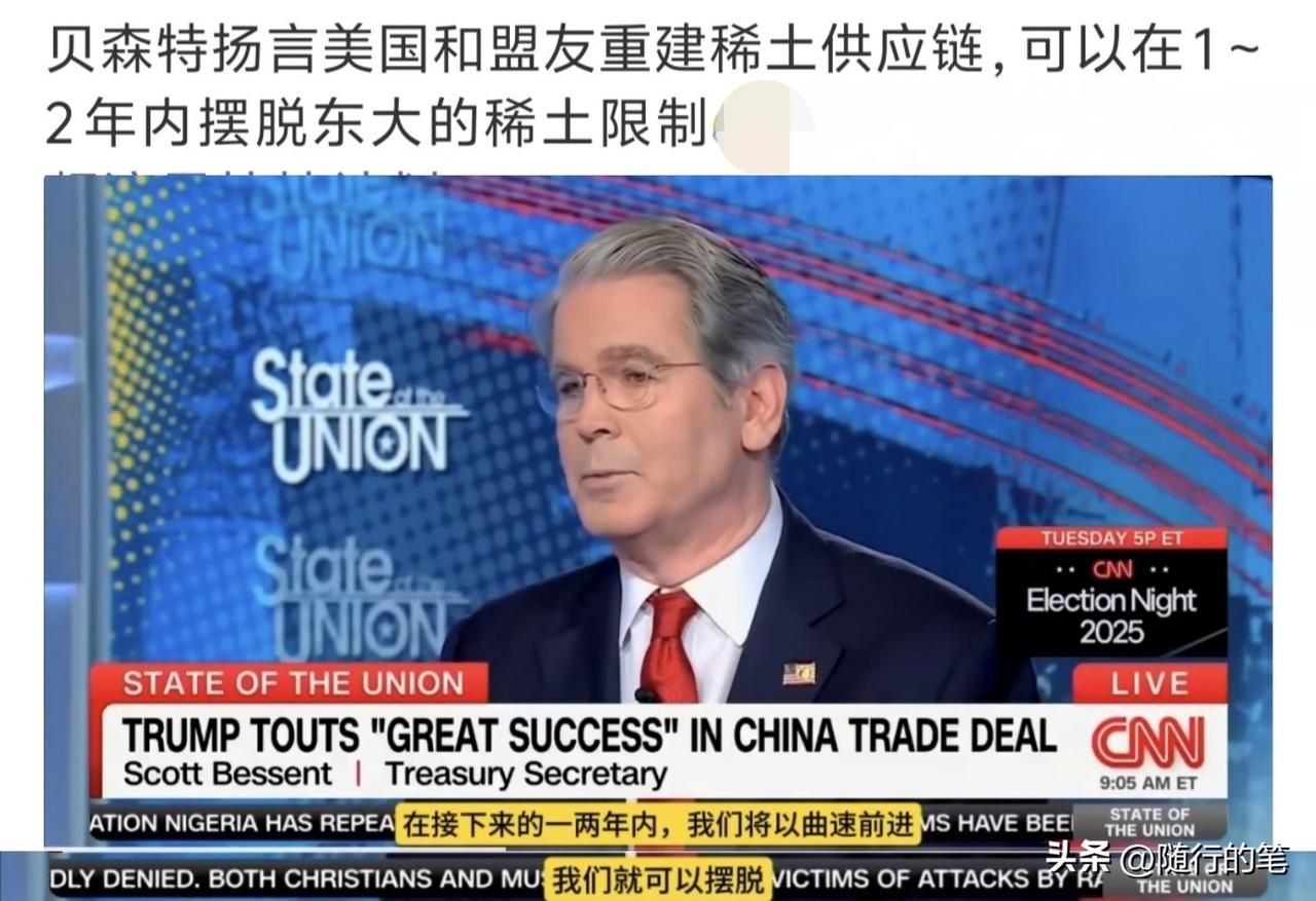 美国能够在一到两年时间内实现稀土自由? 美国财长又接受采访了,在镜头前面侃侃而谈,自信十足。看来在韩国会晤之后,一年的休战让他觉得美国赢得战略机遇了? 他们是意识到稀土的重要性的,也决心要与盟友打造稀土供应链的。 但是,贝森特明显在夸大其词的,不知是在安抚美国国内还是认知偏差,把稀土提炼想得太简单了。 日本早在十几年前就已经开始要打造他们的稀土生产,但是十几年时间过去了,日本对中国的稀土依赖还达到60%几,贝森特扬言要在一到两年时间内摆脱稀土对中国的依赖,分明就是在痴人说梦。