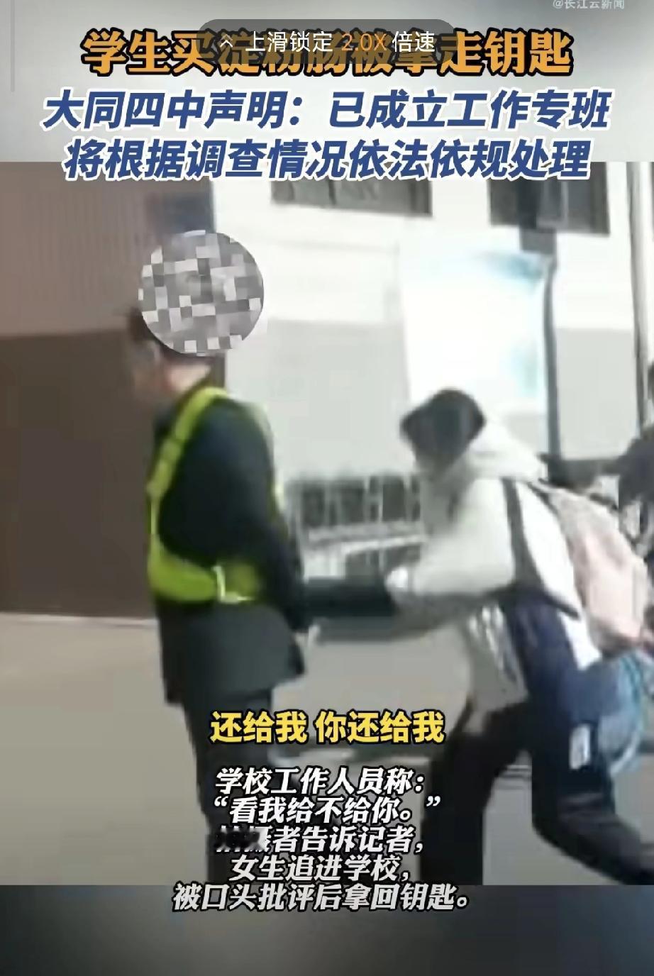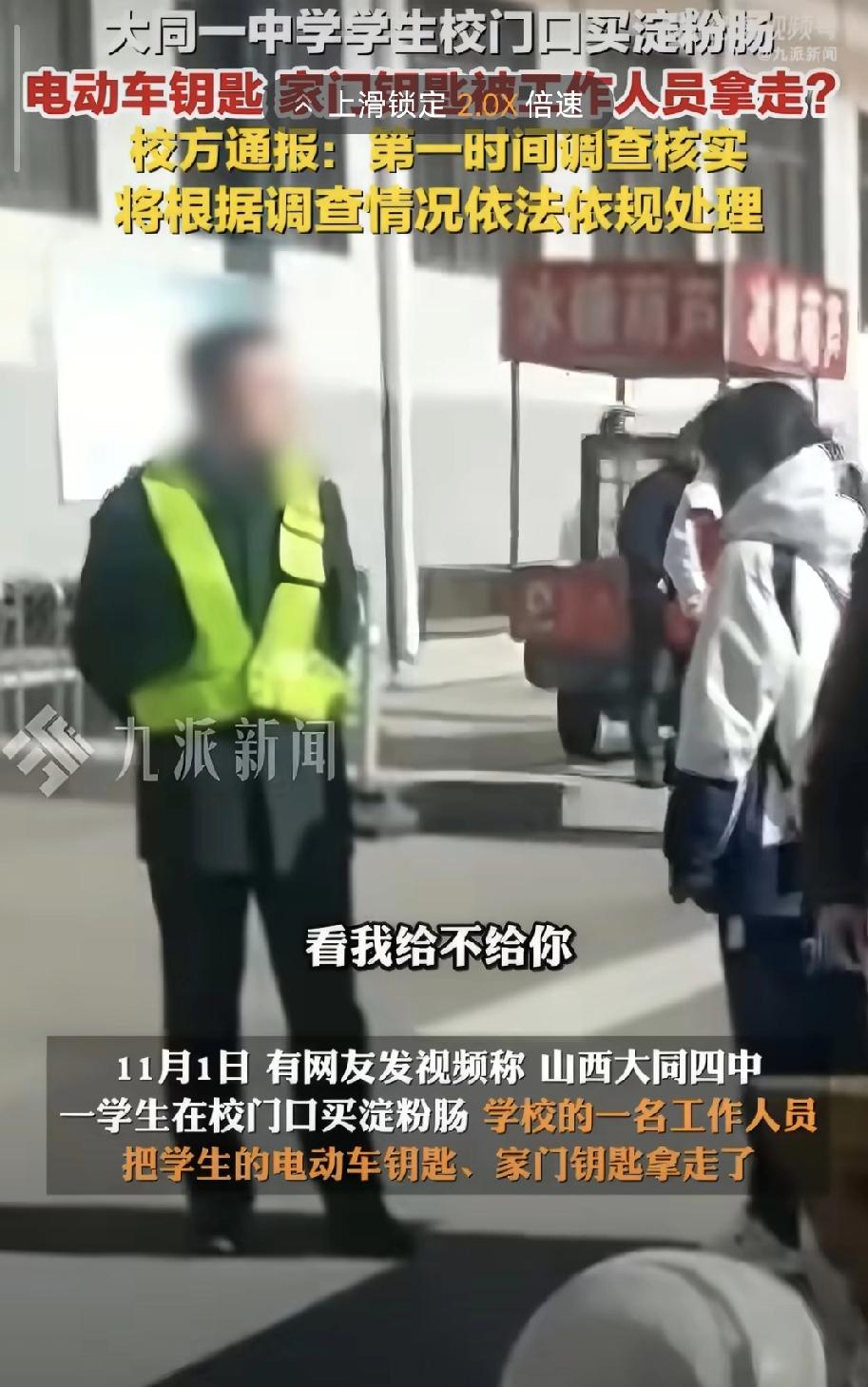 这位拔掉买校门口淀粉肠女学生电车钥匙的人,不会是学校食堂的亲戚吧,还是和卖烤肠的小摊有仇? 人家花自己的钱在学校门口买个两块钱的淀粉肠都不行? 还嚣张的直接拔掉人家车钥匙和家门钥匙, 这已经算是强抢别人财物了, 有一点点权力都使在学生身上了, 整个社会见到学生大部分人都是会选择照顾一下, 唯独学校工作人员会为难学生。 学校还美其名曰担心食品安全问题, 建议先查一下自己学校食堂的食品安全。 这下就算后续处理结果是好的,也没有学生和小摊敢在校门口正大光明的买卖烤肠或者其他摆摊了 大同四中 如何看待学生买淀粉肠被拿走钥匙 学生买淀粉肠被拿走钥匙