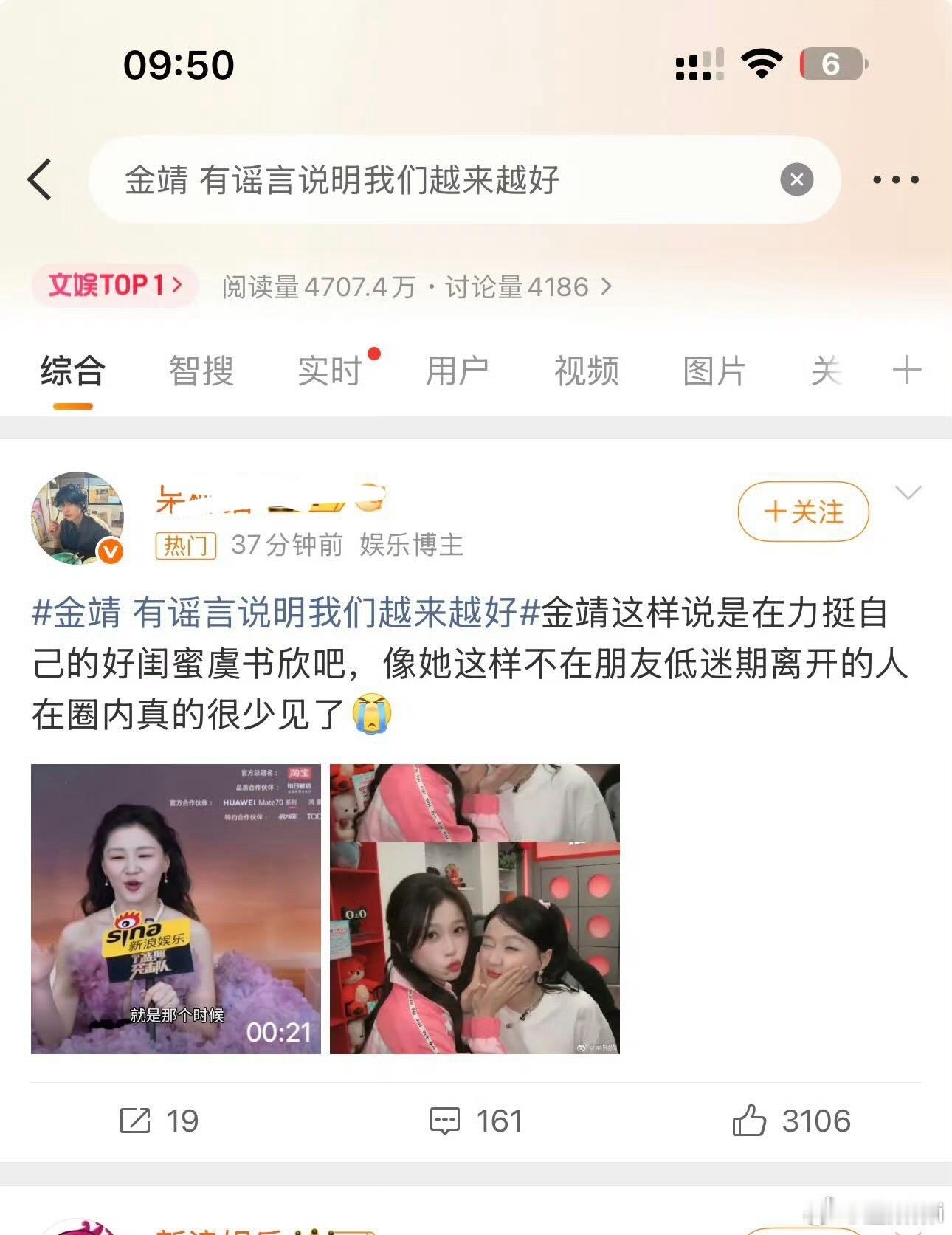 金靖 有谣言说明我们越来越好新浪娱乐发布的采访中明确说明金靖说的是李佳琦,却有通稿抢热门引导大众金靖力挺的是虞书欣,实际上虞书欣翻车以来,金靖并没有发声,而这条故意捆绑的博文一直占据着热搜的热门高位甚至压了正确文案的原博[泪奔]
