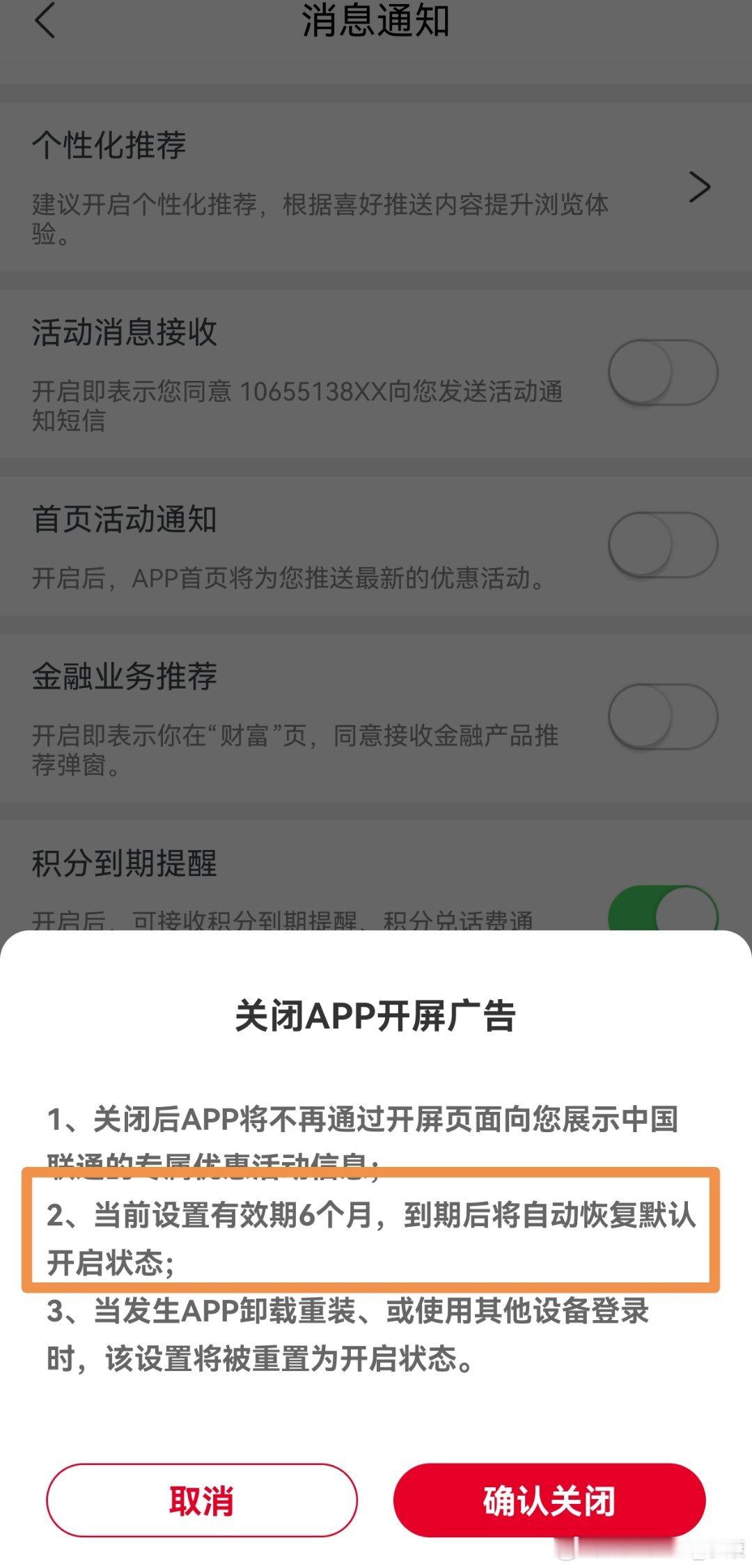 手动关闭开屏广告,提示6个月后自动恢复开启