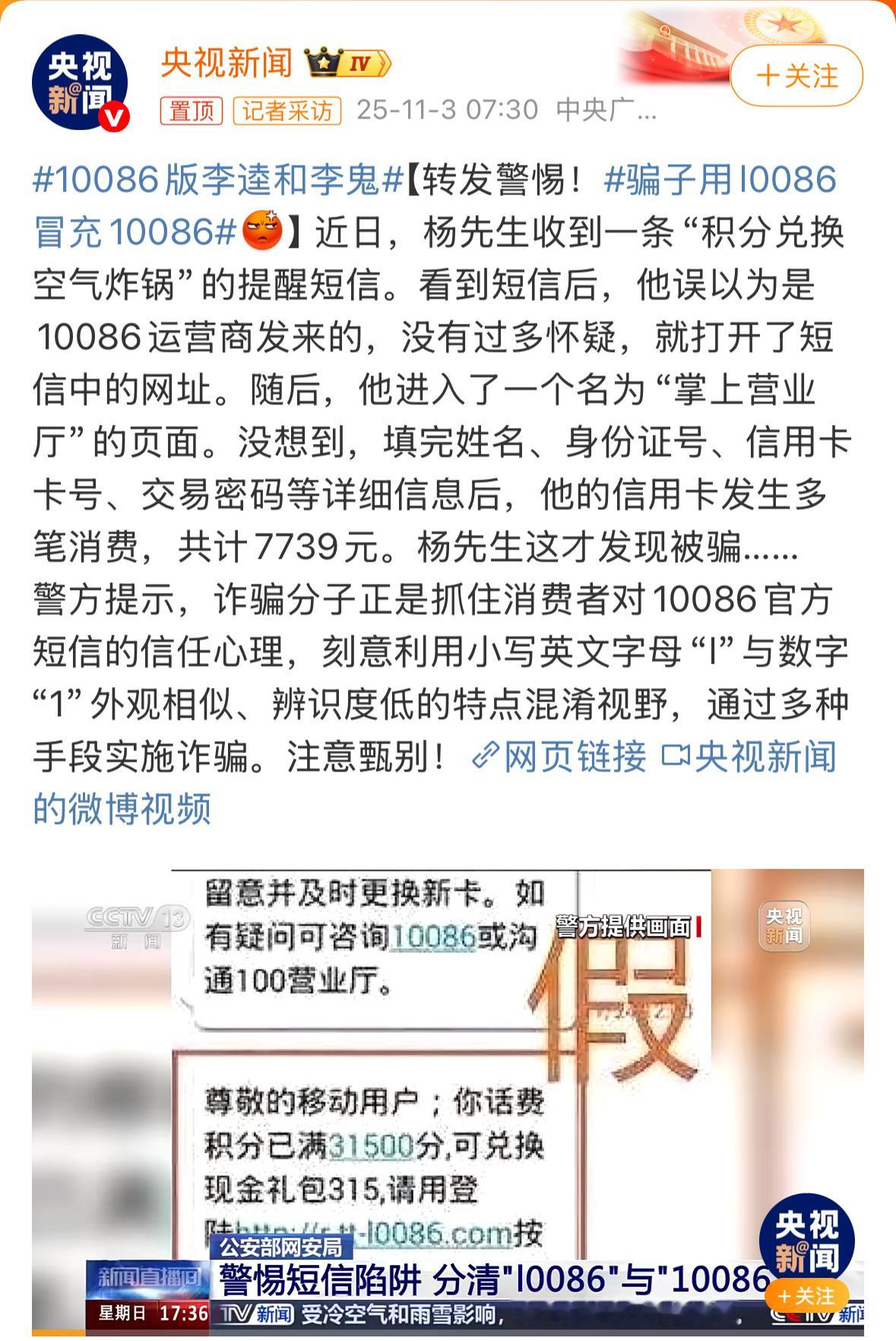 骗子用l0086冒充10086可得留心呀!骗子太会钻空子了,用字母“I”冒充数字“1”,弄个“I0086”假装是10086发短信。