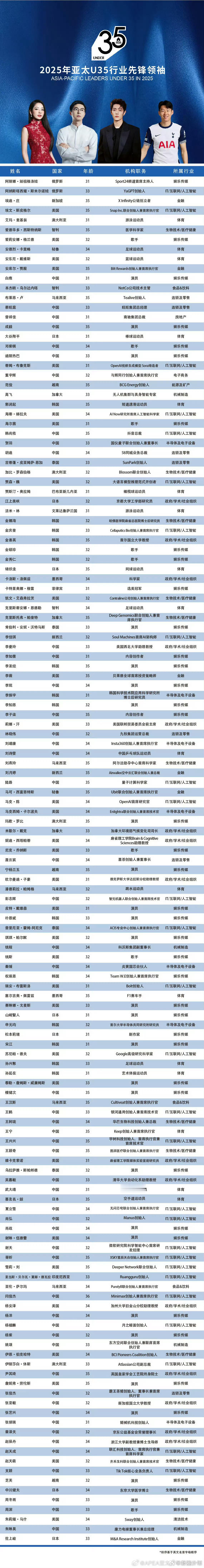 入选亚太U35行业先锋领袖榜单的明星 谁看了这份亚太U35榜单不喊一句“内娱有排面”!迪丽热巴的国际魅力、檀健次的多栖突破、杨紫的国民度……每一位入选的明星,都是用硬实力在35岁以下的赛道里活成了榜样!