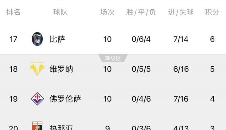 九轮不败、一胜难求 意甲第十轮一场焦点战在圣西罗球场展开激战,坐镇主场的AC米兰凭借帕夫洛维奇的进球1-0战胜来访的罗马,积分追平对手,落后榜首的那不勒斯一分! 由于先赛的那不勒斯主场丢分、0-0战平科莫,国米客场2-1绝杀维罗纳,本场比赛的结果尤为重要,罗马取胜将登顶积分榜榜首,而米兰获胜会让积分榜更加混乱,最终米兰技高一筹,主场取胜,和国米、罗马同分,排名第三! 米兰自从揭幕战主场1-2不敌升班马克雷莫内塞后,联赛九轮不败,如果算上意杯3-0莱切,米兰最近10场比赛取得7胜3平的战绩! 和积分榜前列不同的是,意甲末尾的四支球队至今一胜难求,这在五大联赛里也是独一份,比萨6平4负、维罗纳5平5负、紫百合4平6负、热那亚3平6负,其中佛罗伦萨主教练皮奥利即将下课!