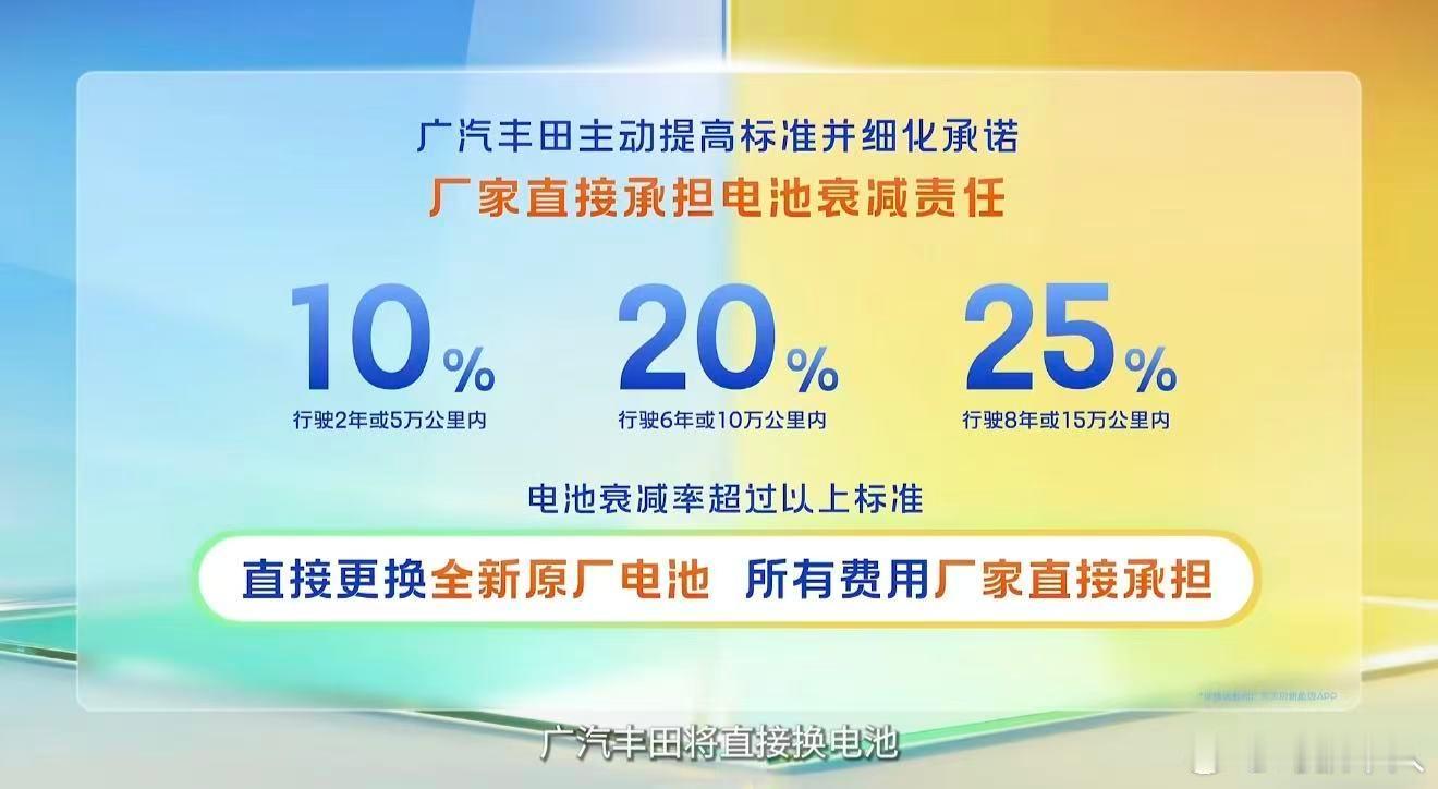 还有这种事情?电池衰减厂家给免费换?这确实牛逼,出乎我意料了。原来广丰铂智3X承诺的是自燃、智能泊车事故厂家担责,现在直接把“双担责”升级成“三担责”了,连电池续航和衰减都给兜底了,开2年/5万公里电池衰减超10%、6年/10万公里超20%、8年/15万公里超25%,直接换全新原厂电池,费用全由厂家包。