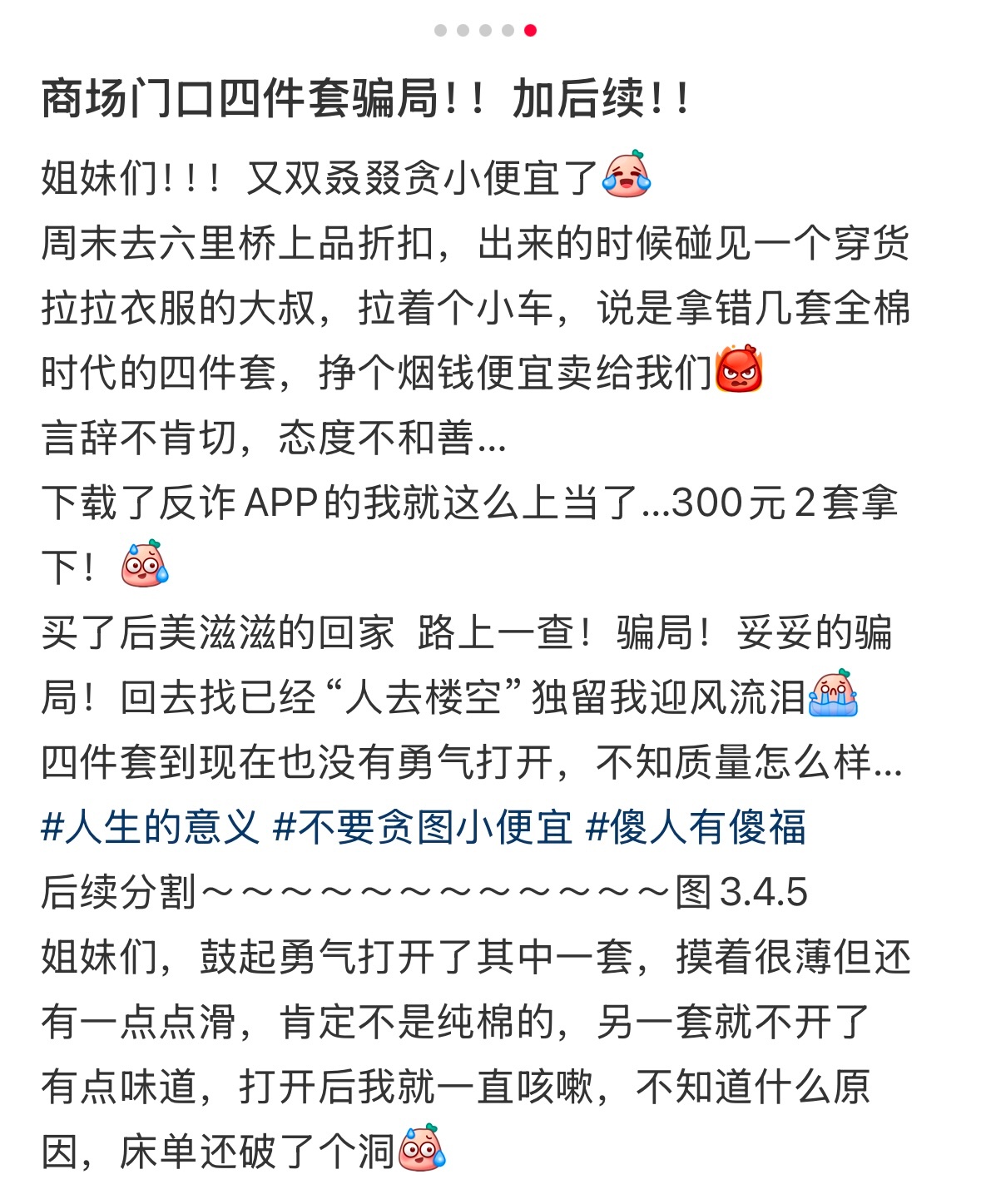今日说法主持人被骗1千元买茶叶现在的骗局真的太多了,一定要多提防!这周末在万象城地下车库,我也遇到了一个中年人,开车门的时候他跑过来气喘吁吁地说给全棉时代供货的多了四套四件套,现在150一套给我。果断拒绝了!还好有个好习惯,在犹豫的时候不做决定。