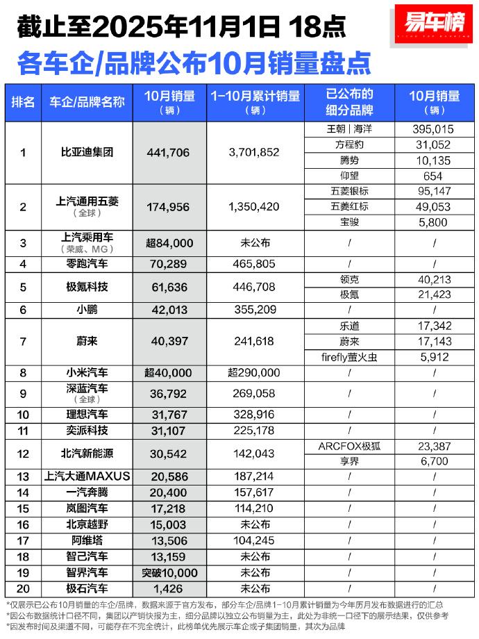 10月新势力销量榜:零跑稳居榜首,多家品牌创新高 11月1日,多家新能源车企公布10月销量数据,整体表现亮眼。从已公布的数据来看: 零跑汽车以70,289辆的月销成绩稳居新势力榜首,这已是其连续多个月蝉联销冠。小鹏汽车交付42,013辆,创历史新高。蔚来、小米紧随其后,月销均突破4万辆大关。 传统车企方面,比亚迪集团依然强势,10月销量达441,706辆,1-10月累计销量已突破370万辆。上汽通用五菱全球销量达174,956辆,表现稳健。 从细分品牌看,极氪品牌10月销售21,423辆,乐道品牌交付17,342辆,均展现出不错的增长势头。北汽新能源旗下的极狐品牌10月销售23,387辆,成为该集团的重要增长点。 总体来看,10月新能源汽车市场持续火热,多家品牌销量创下新高,市场竞争日趋激烈。随着年底销售旺季的到来,各品牌之间的排位战将更加精彩。
