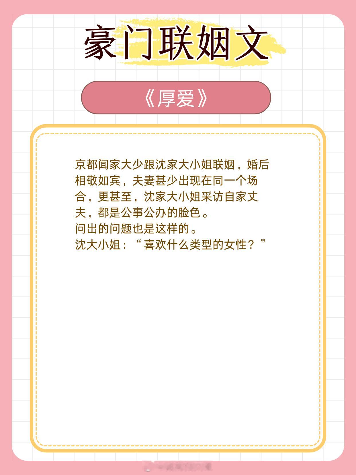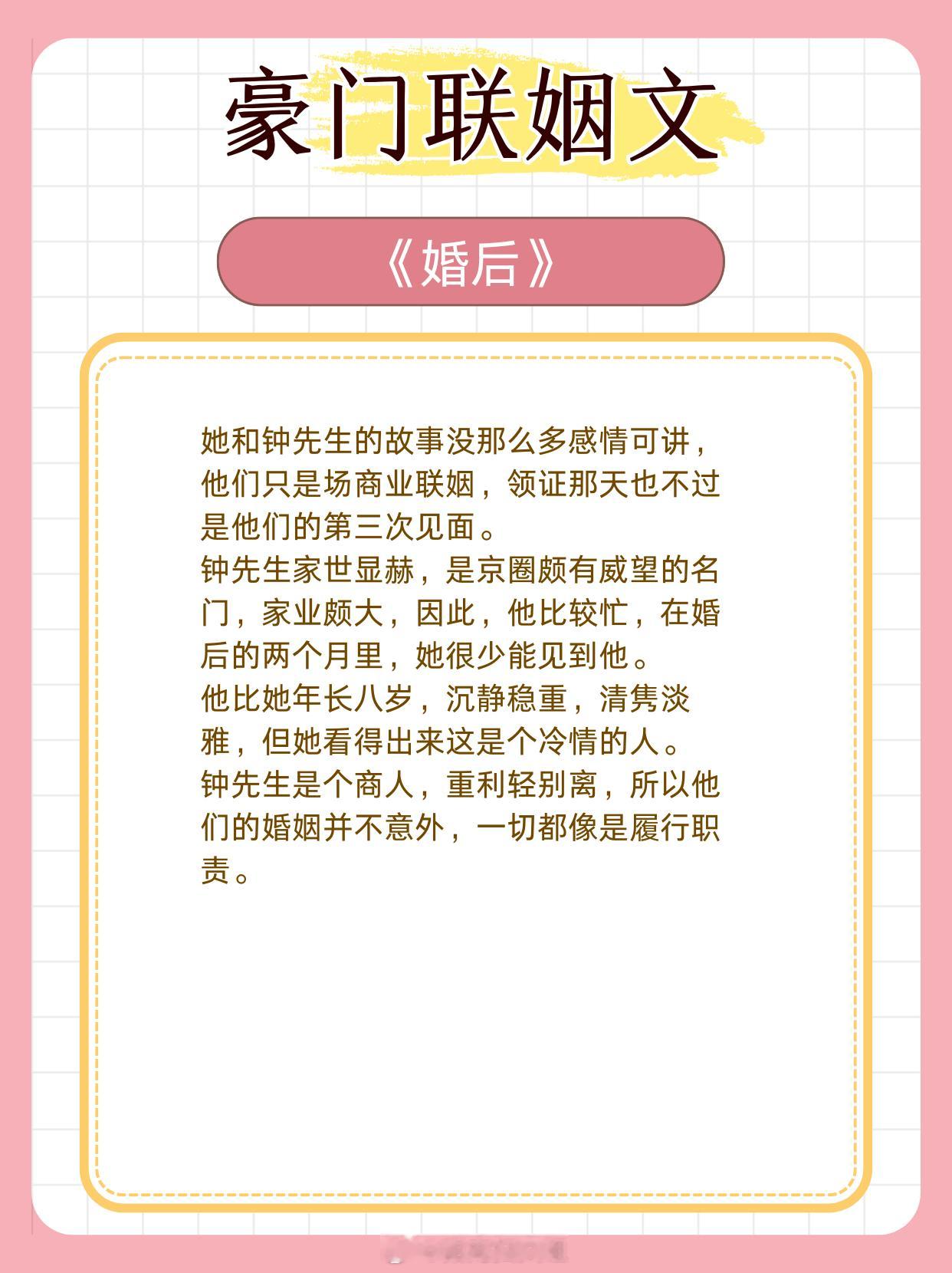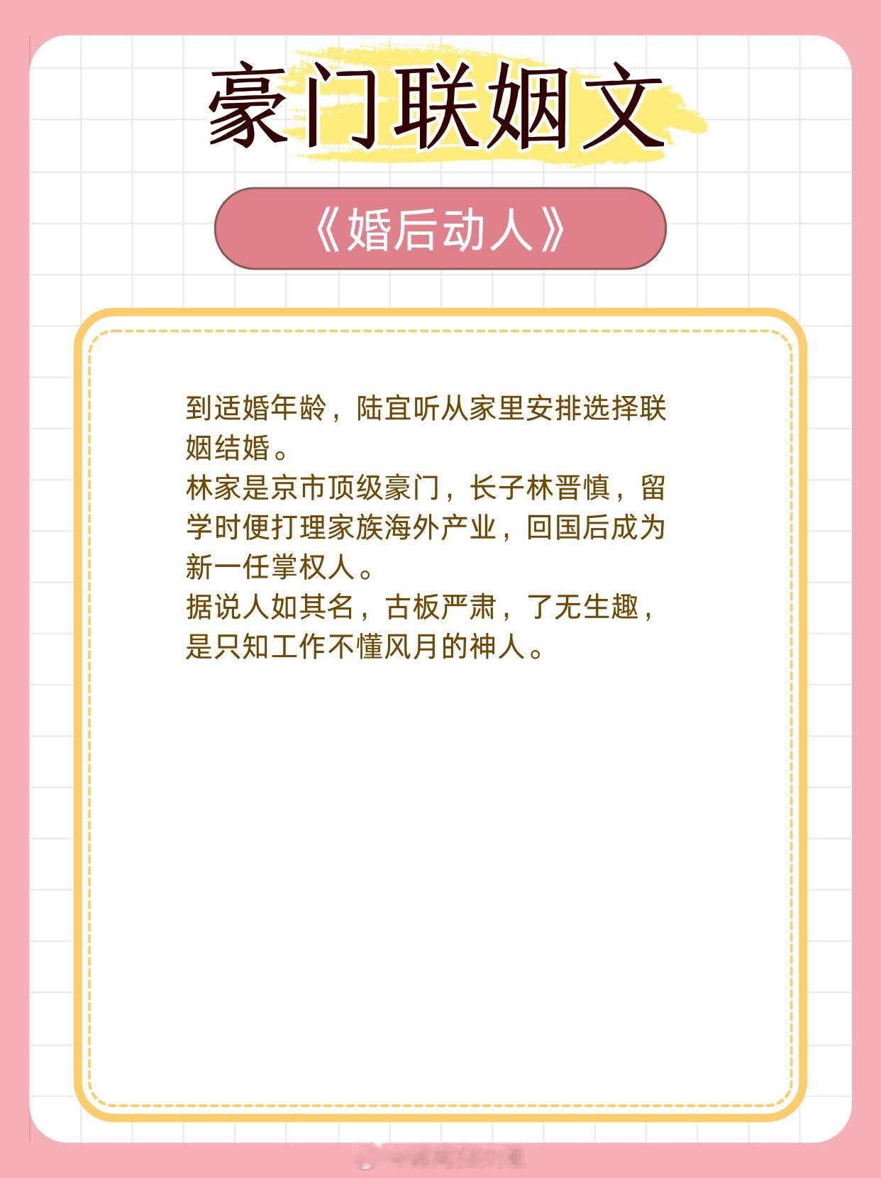 豪门联姻文,初见倾心,一眼万年。1、《不二之臣》作者:不止是颗菜2、《婚后动人》