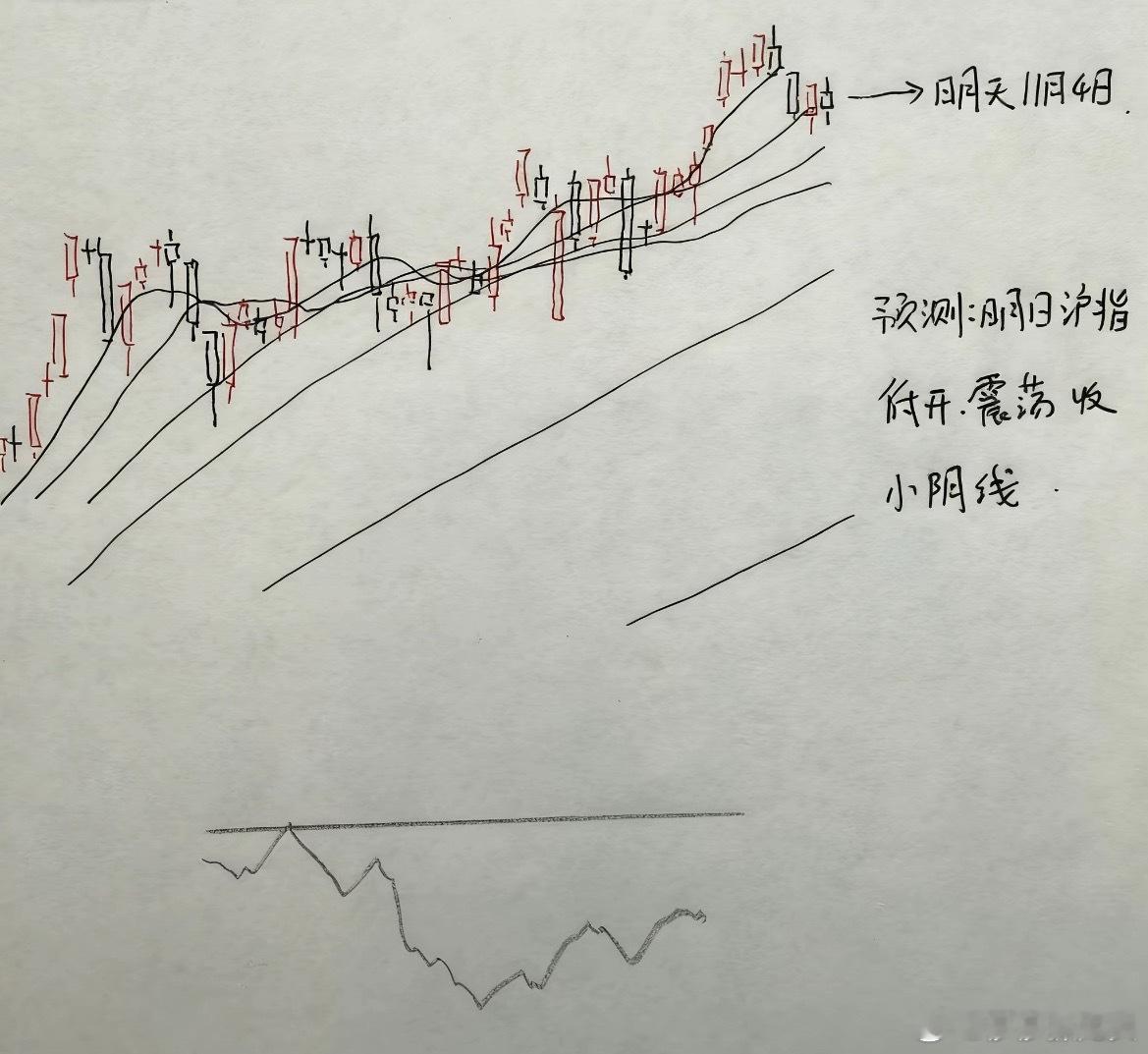 所以综合以上分析,我对于市场指数,明天的判断是相对谨慎的。莎莎认为明天上证指数或者在5日线的压力下收出一颗小实体的阴线。那么明天A股到底怎么走?大家请看图三关于明天走势莎莎手绘的预测图