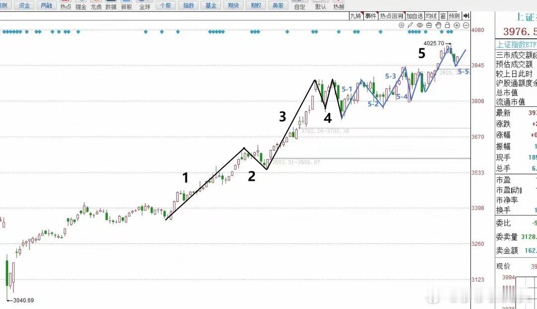 第三,上证指数目前。正在运行的很有可能是波浪结构里面的衰竭的第5浪结构。我们可以看到每一轮指数反弹的时间及空间都远不及前面的一浪和三浪的主升波段。美上的一个小的波段就会出现下行的走势。大家请看图二,(上证指数浪型结构预判图)。我们可以看到,在第5浪的结构当中,上证指数的上涨已经变得不再那么流畅和自然了。