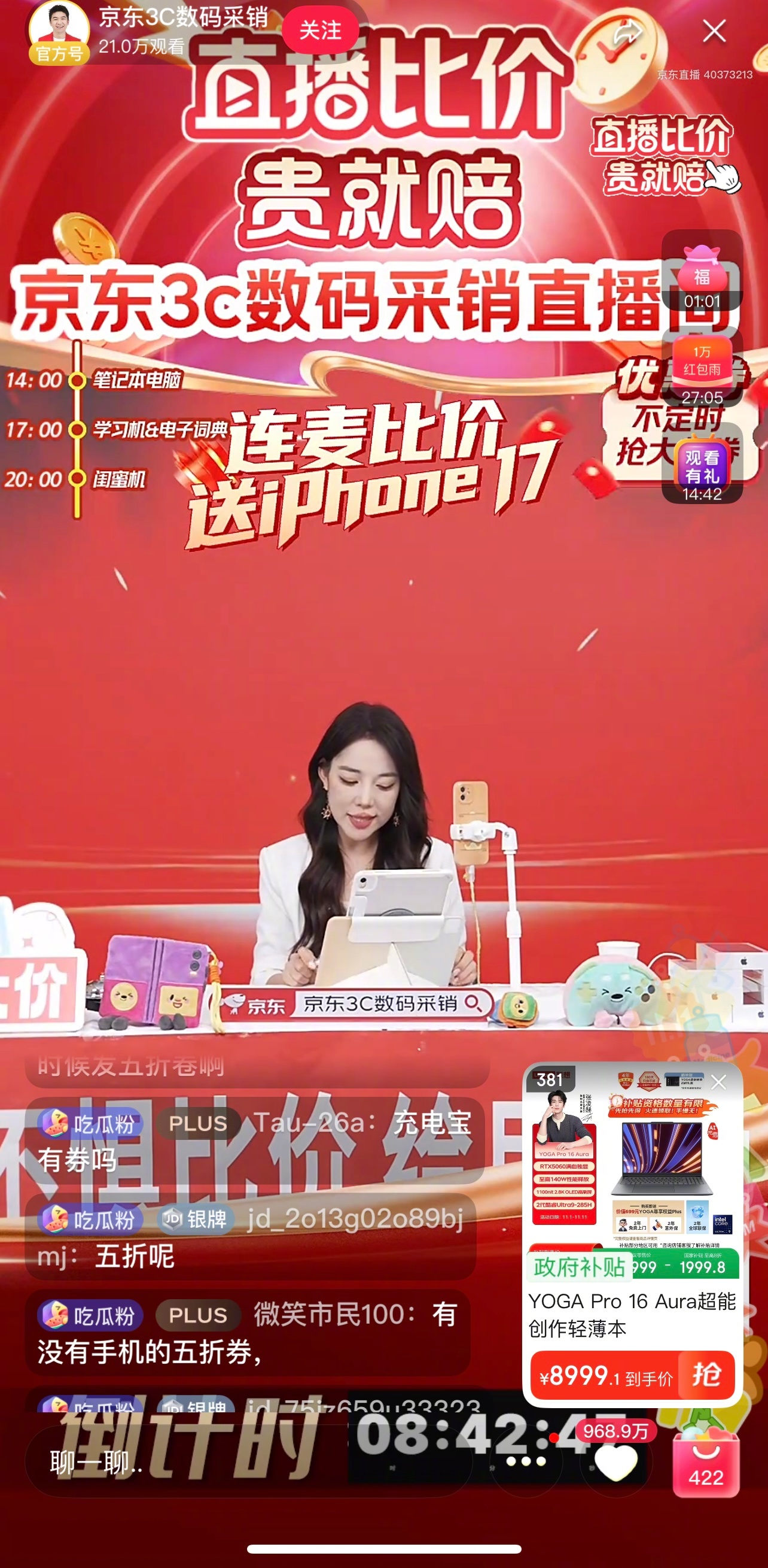 偶然看了眼京东采销直播间真是大开眼界,他们居然推出了【直播比价】活动,就是网友可以直接连麦采销,比一比哪家更便宜!只要你在其他平台找到同款商品比京东还便宜,就有机会拿到——💰万元现金奖励、📱iPhone17、🛒千元超市卡!这真是大手笔啊[偷笑]!作为消费者,每年双十一最怕的就是——买贵了。闲着也是闲着,喜欢媷羊毛的同学可以去看看,说不定能拿个万元大奖啥的!用户连麦京东直播领到iPhone17