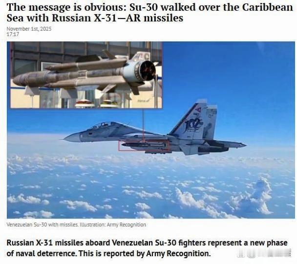 委内瑞拉空军苏-30MK2V战斗机挂载Kh-31A超声速反舰导弹在加勒比海巡逻,对美国海军发出警告。 近段时间,美国在委内瑞拉周边部署重兵,而且美国总统老特公开说要对委内瑞拉动武,搞得加勒比海地区局势急剧紧张。 面对美国的军事威胁,委内瑞拉自然不能怂,否则可就真的是灭顶之灾了。