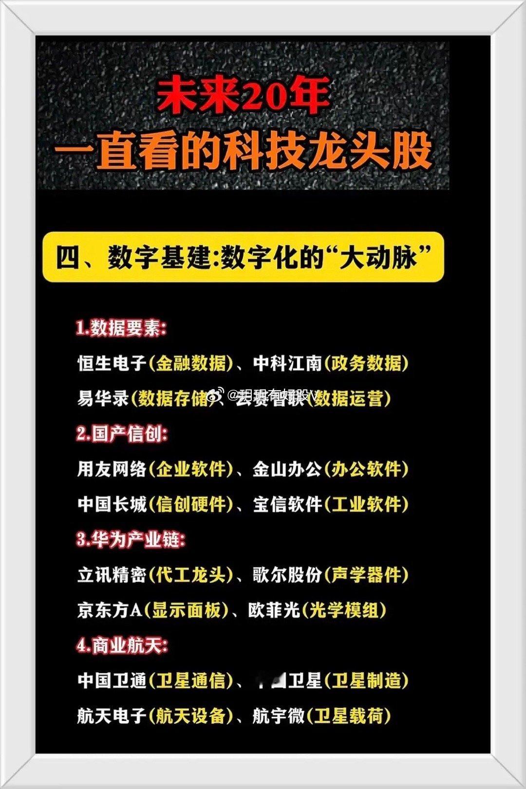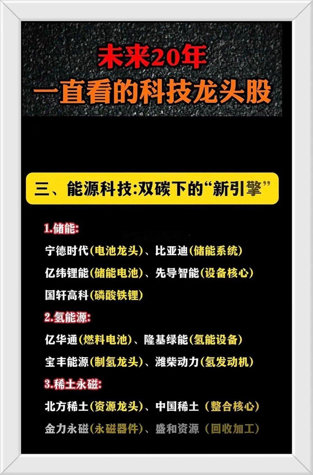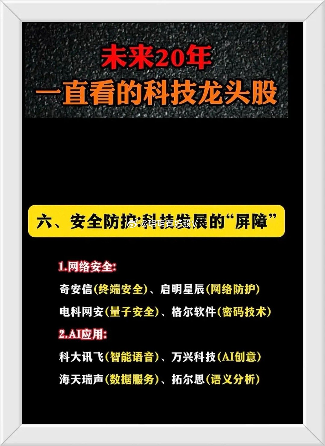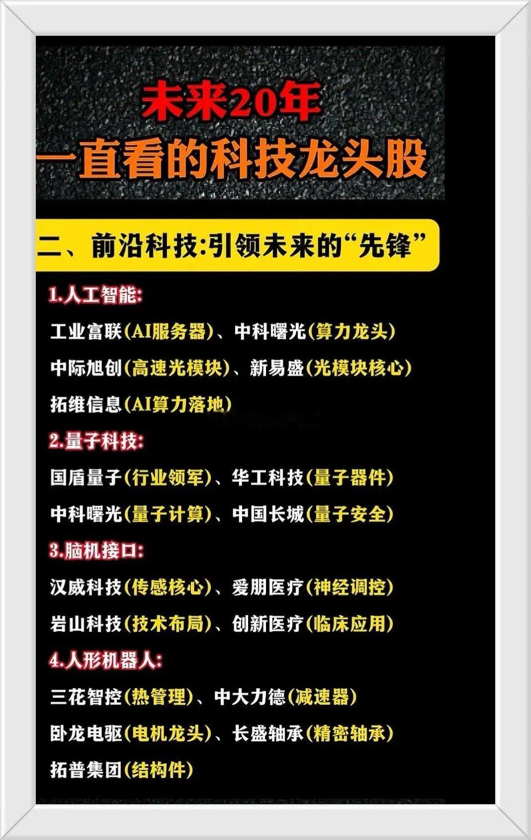 综合来看,这组图片全面覆盖了从基础硬件到前沿技术、从能源支撑到数字基建、从制造升级到安全保障的科技全链条,所列企业均为各细分领域的龙头或核心参与者,反映了未来20年科技产业发展的重点方向和投资关注的核心标的。