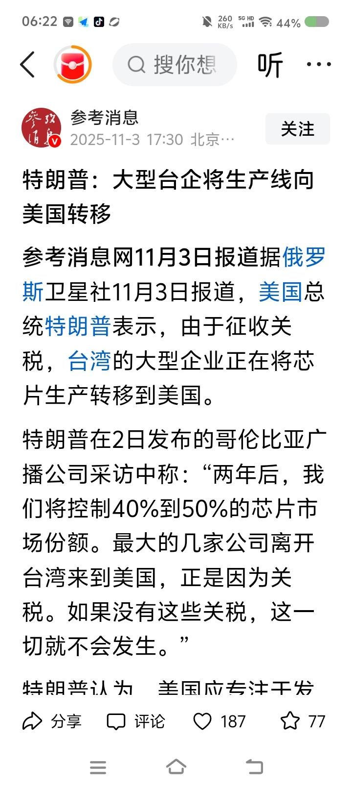 特朗普对中国台湾企业的劫持!—— 据报道,11月2日,特朗普表示,由于关税影响,台湾大型企业的芯片生产向美国转移。 点评: 呵呵,真得仅仅因为关税? 特朗普政府无耻,而台湾民进党当局无耻加无能了!一个强盗,一个类似“殖民政权”,能有什么好事? 解放台湾,刻不容缓!