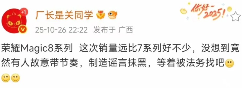 只能说黑子太多了!荣耀Magic8系列的销量其实还不错的故意被人带节奏,总的说这次的8系列比荣耀Magic7系列各方面都有很大的提升,手持的一台荣耀Magic8用了一段时间,只能跟大家说是真的很香,谁用谁知道,无论是流畅程度还是屏幕方面,都很强!