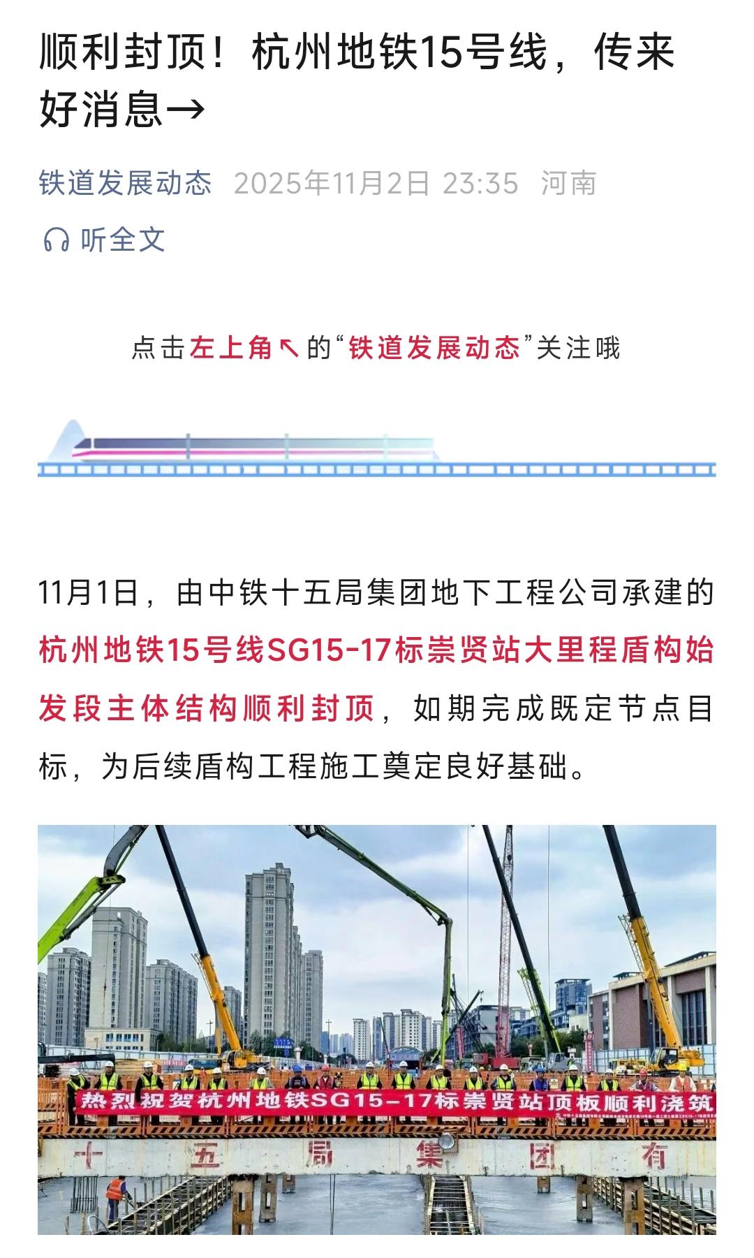 从11月2日的消息看杭州地铁15号线盾构工程建设取得了突破性进展,这对于杭漂来说