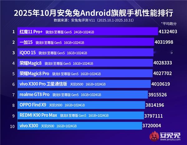 安兔兔10月安卓性能榜出了,红魔11Pro+登顶,第五代骁龙8至