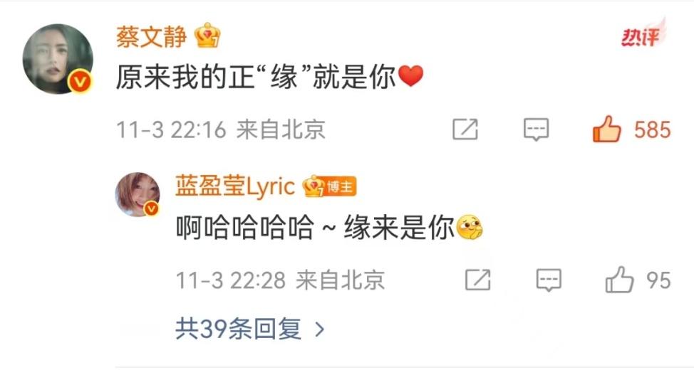 蔡文静蓝盈莹美的很巧合白的很闪耀 蔡文静蓝盈莹微博互动好鲜活呀~“美的很巧合”“白的很闪耀”,两人各有各的美,蔡文静优雅温婉蓝盈莹温柔大气,正好诠释了纯白共同勾勒出的动人身姿!咱就是说蔡文静真的很可爱啊,还说蓝盈莹是她的“正缘”,蓝盈莹的回复也很暖心!支持女明星们贴贴,好看爱看😆也期待合作啦!