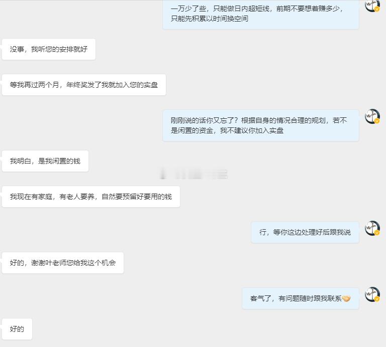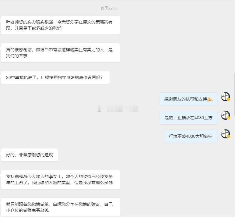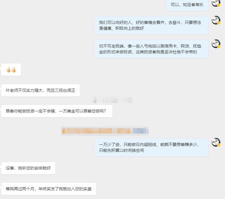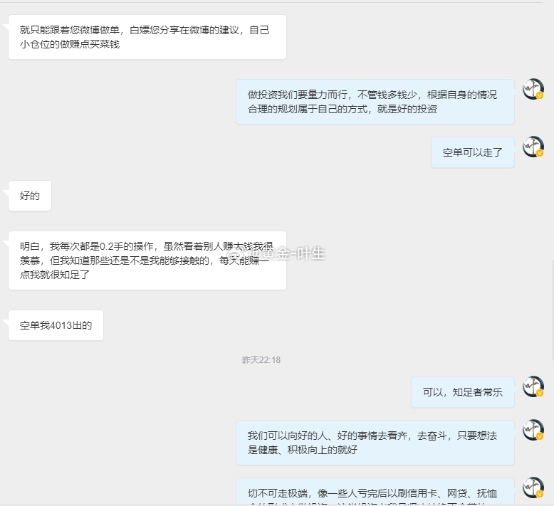 我一直相信相遇就是缘分,能够达到合作,说明我也有吸引你的地方,以及你也有吸引我的地方。同时我也在这里跟粉丝朋友们再次说明一下,叶生我这里绝对不会存在区别对待,也没有谁能保证百分百的收获,一直不亏是不可能的事,但是说过很多遍,我们目光要长远,只有长期的稳健盈利能够让我们满意,那么相信一直坚定不移,做到真诚对待互相信任,一起实现稳定收益,我们的未来也将实现更大的收获,更大目标和梦想!