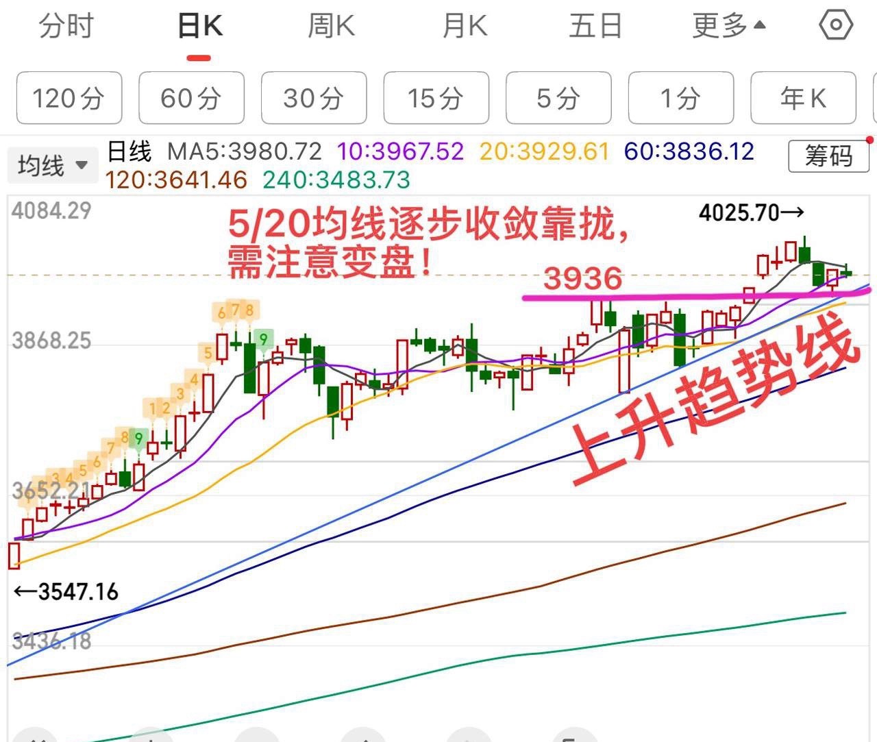 需要注意的一点是大盘的60分钟macd能否金叉,如果该金叉不金叉反身形成倒鸭嘴,就会迫使大盘日线macd死叉,则顶背离确认,调整的周期就会拉长,3936就不一定守得住,所以这个位置还是比较敏感的,需注意盘面的走向变化。