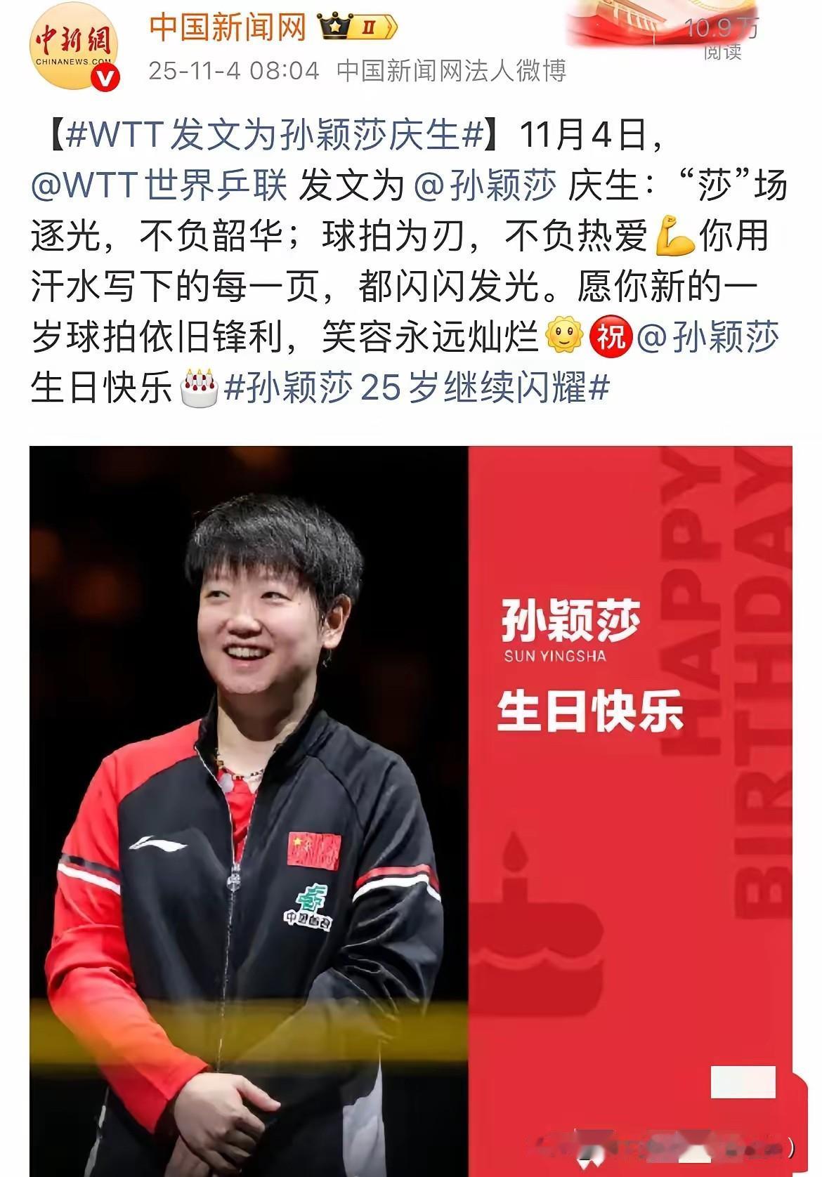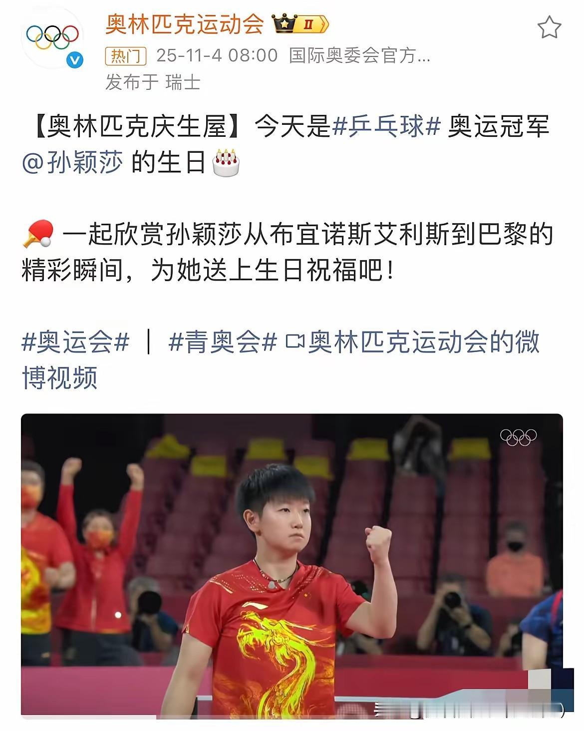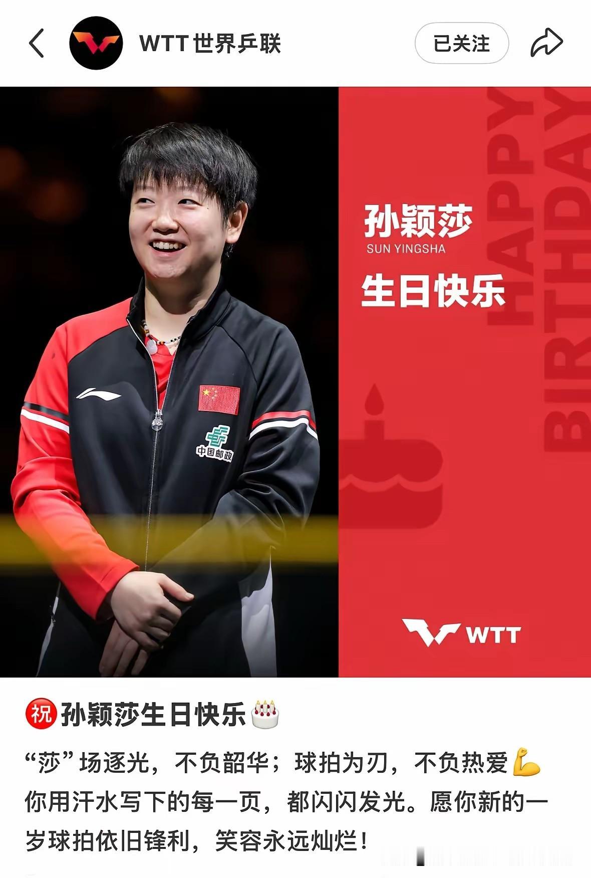 这排面真的看傻了!孙颖莎生日这天,人民日报、国际奥委会全来送祝福,世界乒联还特意写文案夸她“球拍锋利、笑容灿烂”,这哪是庆生,分明是官方盖章的“顶流”认证! 别光说场面大,这都是她用实力攒下的人缘。连续150周霸榜世界第一,拿遍奥运、世乒赛冠军,赛场上是靠谱的“铁血一单”,赛场下会给对手递水、对前辈谦逊。 这种又强又暖的特质,才让她赢了不止是成绩,更是国内外的真心认可。所谓“念念不忘必有回响”,不过是优秀的人从不缺掌声。 你粉莎莎是因为她的比赛,还是这份动人的人格魅力?孙颖莎 孙颖莎名场面 孙颖莎笑容 孙颖莎情商 孙颖莎演技