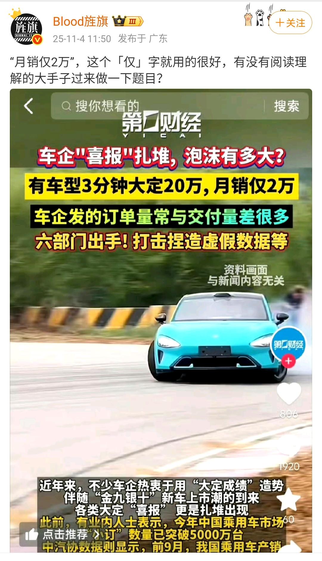 艹老师:“月销仅2万”,这个「仅」字就用的很好,有没有阅读理解的大手子过来做一下题目? ​​​ 该媒体还特意写了一下,资料画面与新闻内容无关,关键无关换其他的东西不行吗? 月销2万已经超过了90%的车企的,别说月销2万了,月销超过5000都属于非常畅销的车型了。 各位是怎么看的?欢迎评论区留言。