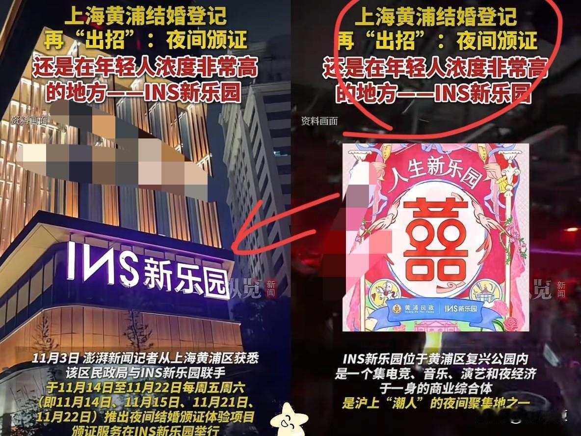 一觉醒来, 上海的丈母娘要慌了, 因为女儿可能在夜店就把自己给嫁了! 黄浦区民政局和INS新乐园的夜间登记是真的,但人家是潮流商业综合体,可不是单纯的夜店! 11月14到22号的周五周六晚上开放,得提前预约,还有专属管家盯流程,比传统登记还细致! 说白了,这就是政务服务在“贴着年轻人来”,现在上海初婚年龄都快31了,年轻人要仪式感又没空挤工作日,把领证点搬到他们常逛的地方,才叫懂需求! 担心“冲动领证”的真多余,现场不仅会确认新人清醒状态,还配了婚姻辅导! 这哪是纵容草率,分明是用年轻人爱吃的“形式”,包裹婚姻该有的庄重! 政务服务肯放下架子贴近潮流,真的该夸!毕竟婚姻的靠谱从来不靠场地,靠的是两个人的真心! ​大家赞成这种做法吗?