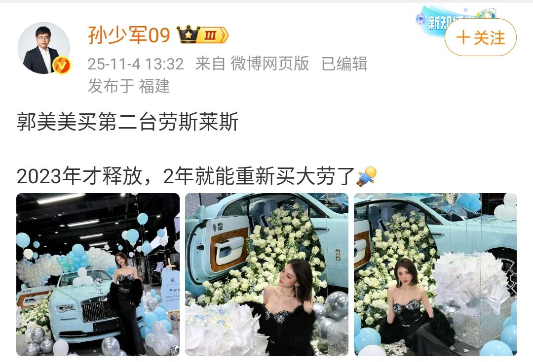 郭美美购买第2台劳斯莱斯! 2023年释放两年就能重新买大劳了! 这个挣钱的速度远远超过普通人呀,别说在这一方面99.99%的人都赶不上她。 看这辆劳斯莱斯也知道不便宜的车型,劳斯莱斯也没有便宜的车型。各位是怎么看的?欢迎评论区留言。