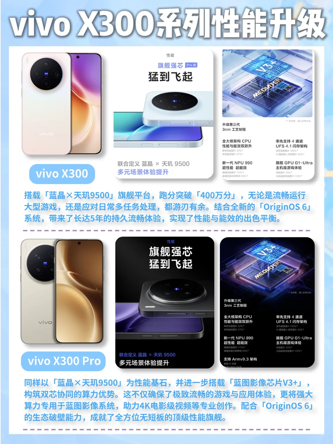 ✨性能系统:X300搭载了天玑9500 + OriginOS 6,安兔兔跑分突破400万,无论是多任务还是高帧游戏,流畅度优于上代天玑9400的X200 Pro mini