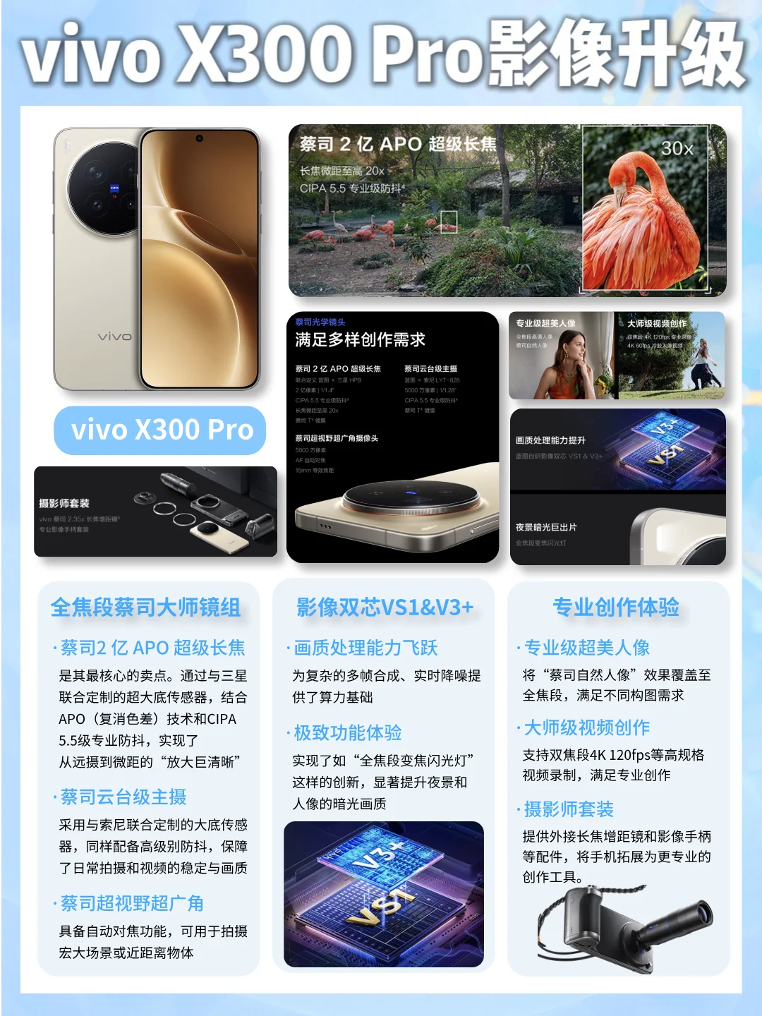 ✨影像系统:X300 Pro主打2亿长焦+云台级主摄+全焦段变焦闪光灯,日落/暗光能保留暗部细节,长焦抓拍成功率有一定提升,覆盖3种不同焦段,影像的升级使得拍摄/视频创作能力更强