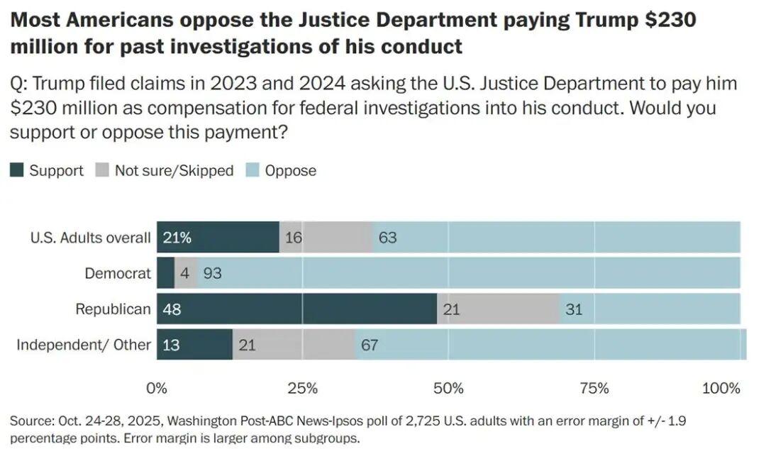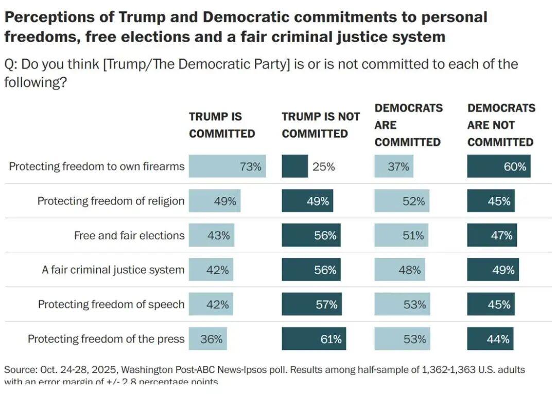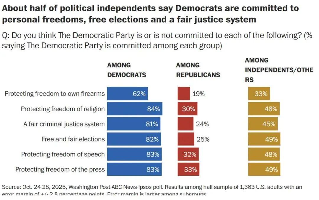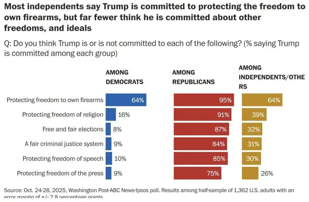 CNN与SSRS联合进行的最新民调结果显示,特朗普的处境极为不利,其不支持率高达63%,创下他两届任期内CNN调查中的最差纪录。超过六成选民表示,特朗普使美国经济状况恶化,并滥用总统权力。此外,民主党选民在本次中期选举中的投票热情更高。但是,民主党自身不受欢迎,削弱了其优势。他们在中期选举中的总体支持率上仅领先共和党5个百分点,这一差距不到2017年同期的一半。 据《华盛顿邮报》/ABC/Ipsos的联合民调显示,多数选民反对特朗普的权力操作,认为他在打击政治对手方面做得太过分,且不致力于维护自由公正的选举、公正的刑事司法体系、言论自由和新闻自由。然而,在这些方面,民主党的支持率也仅略高一些,优势并不显著。 图片来源于网络