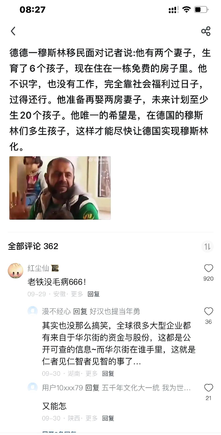 这个记者真厉害,居然能采访到对当事人不利的消息,一般需要刑讯逼供才能拿到这样的口供。好,再娶5个老婆,吃完榨干德国福利,欧盟就要这样从内部瓦解。以前都是靠武力,经济掠夺资源,现在靠生殖器置换资源。它们不喜欢它们的母国,但是它们移民到欧美国家后,它们又想把所在国变成它们不喜欢的国家模样。黑子在法国也这样说,阿三在加拿大也这样说,问题来了,在我国的黑子、阿三、穆斯林,是咋想的呢……