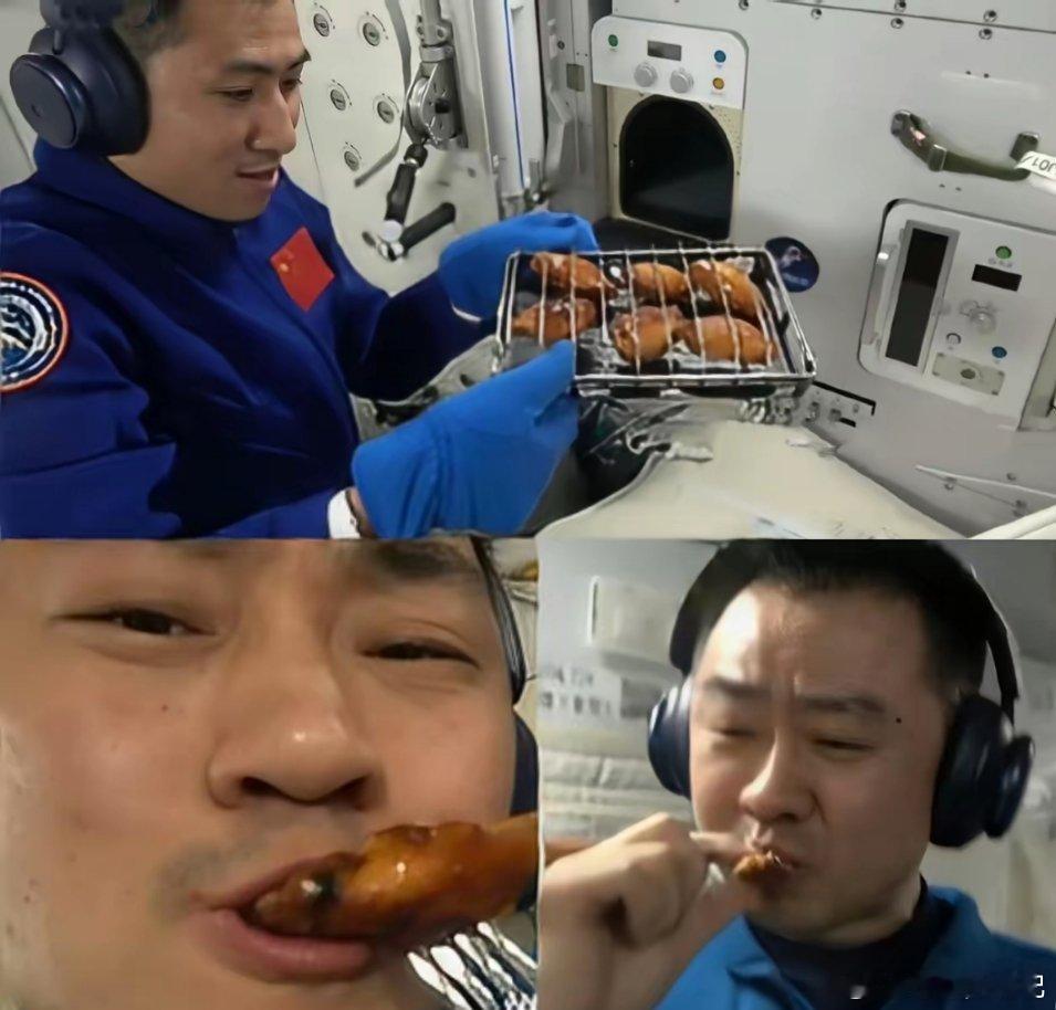 不得不说,咱们的航天员是真会“整活”。当烤好的鸡翅被拿出来时,镜头里清晰可见航天员们眼中的惊喜与期待。那鸡翅烤得色泽均匀,油光锃亮,诱人的卖相隔着屏幕都仿佛能闻到香味,连地面指挥中心的工作人员都忍不住隔空喊话“想吃”。