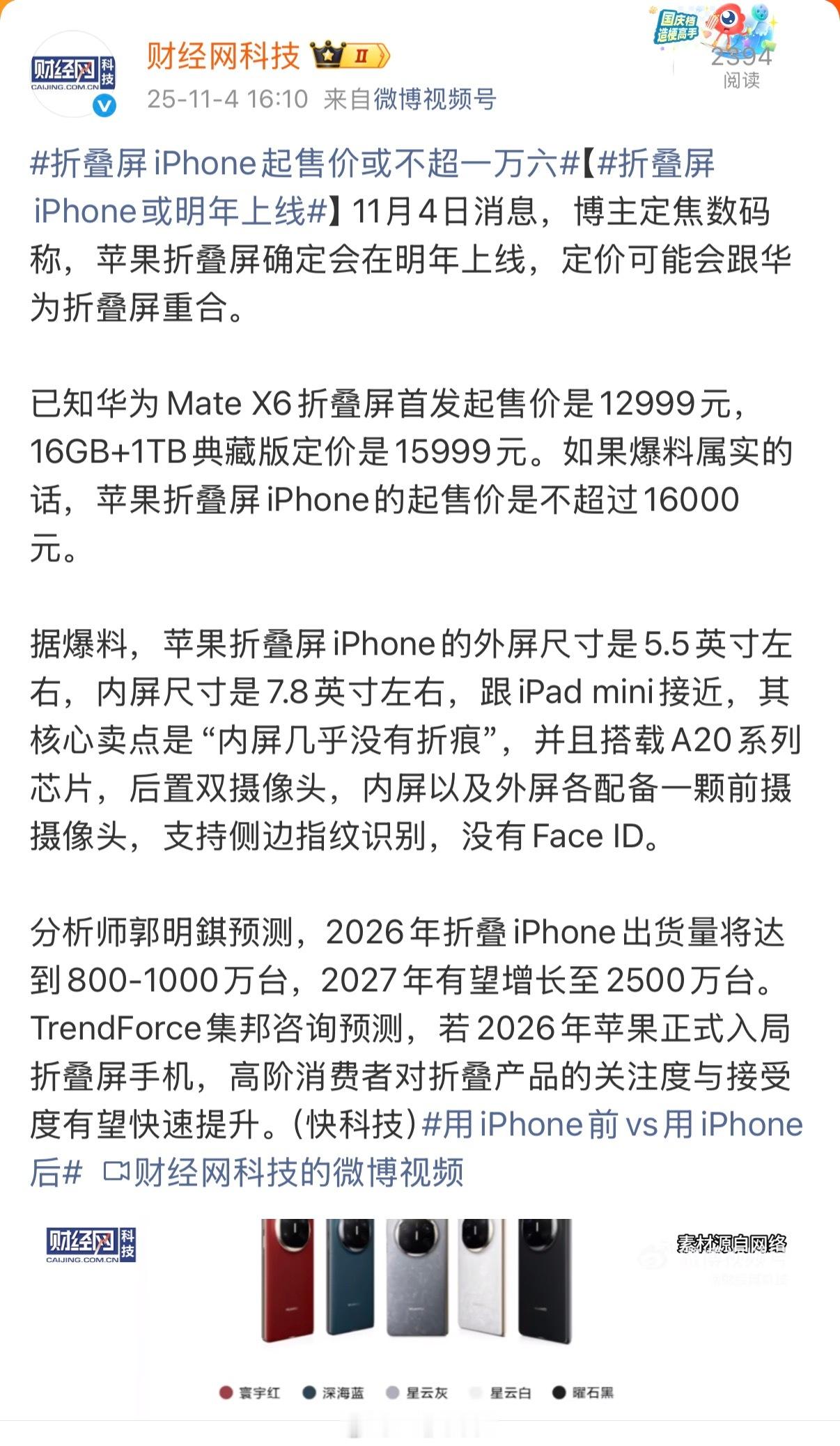 折叠屏iPhone起售价或不超一万六
