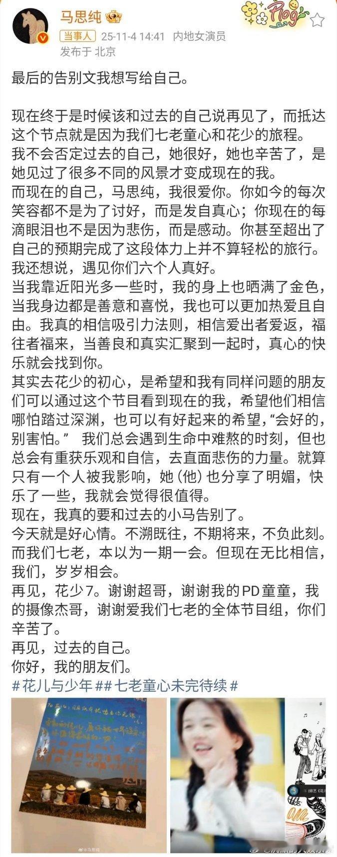 很高兴看到她说要和过去的小马告别了。“我不会否定过去的自己,她很好,她也辛苦了,是她见过了很多不同的风景才变成现在的我。而现在的自己,马思纯,我很爱你。我还想说,遇见你们六个人真好。当我靠近阳光多一些时,我的身上也晒满了金色,当我身边都是善意和喜悦,我也可以更加热爱且自由。”
